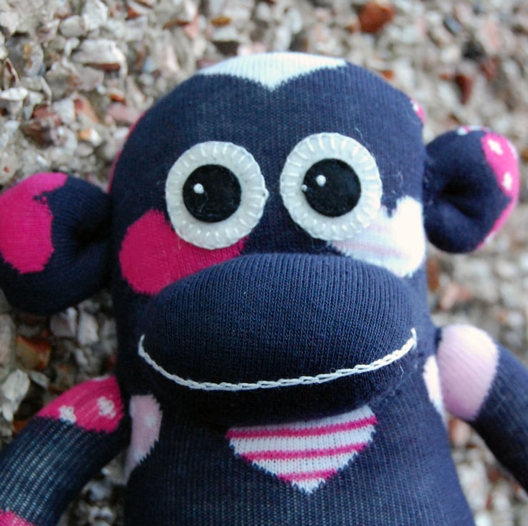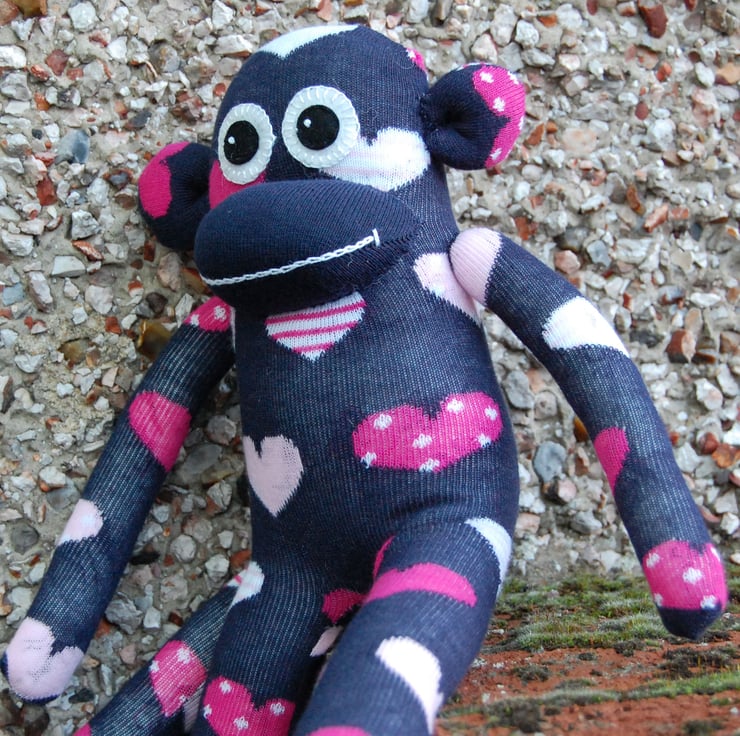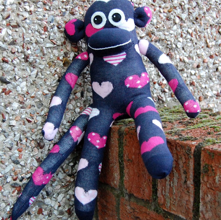 Valentina is a fun soft monkey toy made from brand new heart patterned socks and filled with polyester fibrefill conforming to EN71, CE marked and safe for babies, children and adults too.