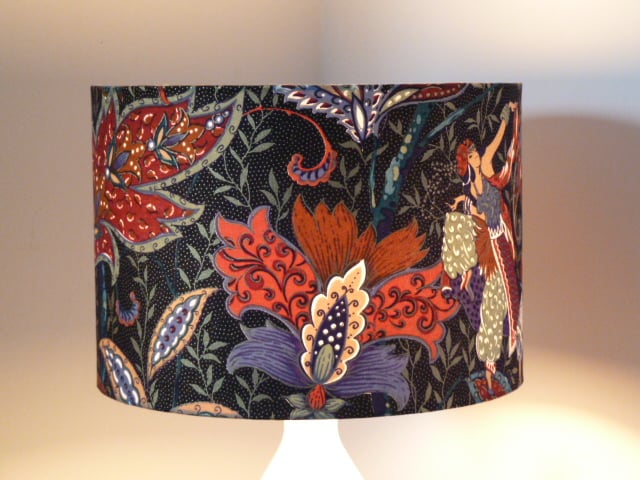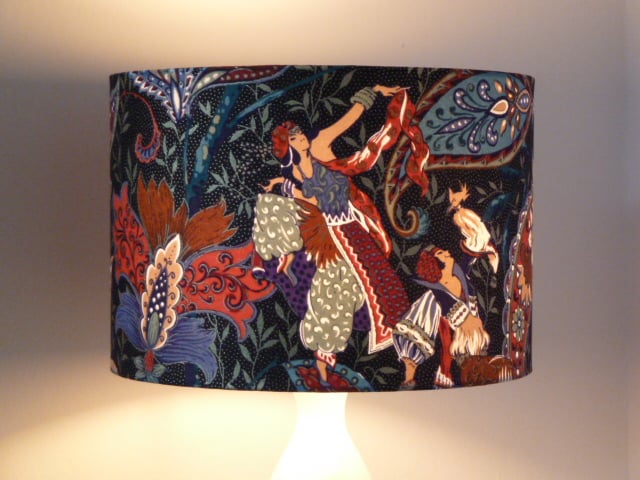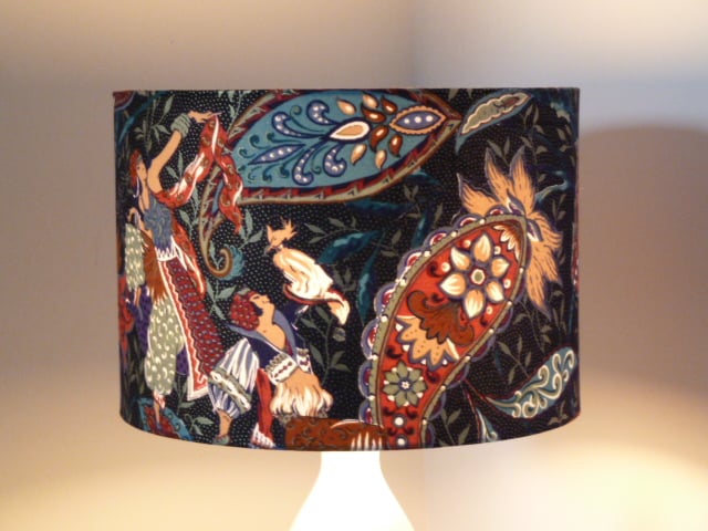 This is a 1990 fabric, maker unknown to me, and I've decided to call it 'Arabian Nights'. My head tells me this shouldn't quite work on a lampshade...but I'm afraid it just does and it looks particularly gorgeous when lit up.