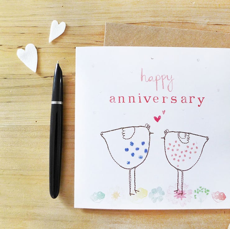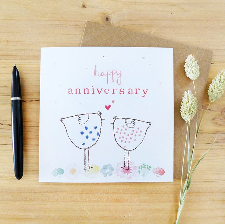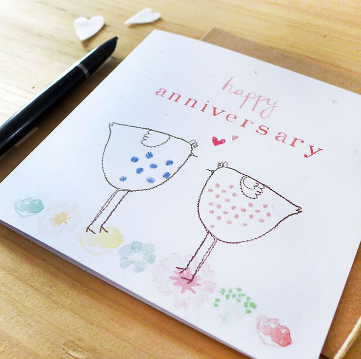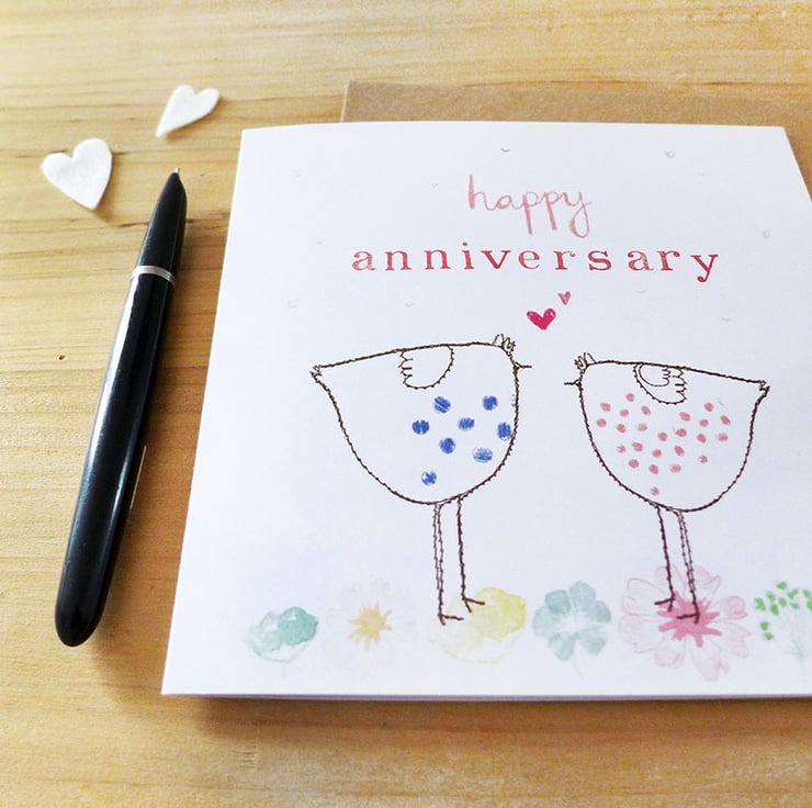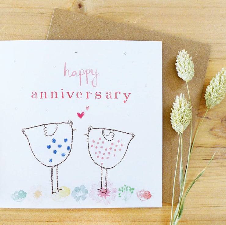 A lovely large square 'happy anniversary' card featuring Charlotte's embroidered illustrations, potato printed hearts, and printed in the UK.