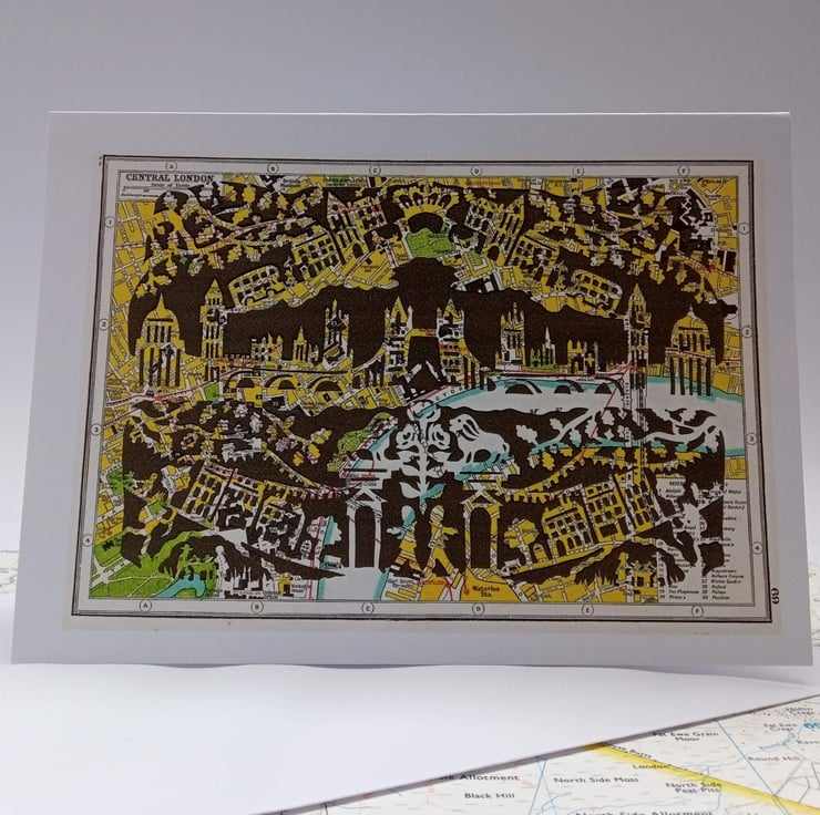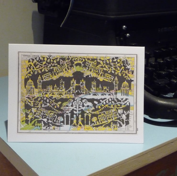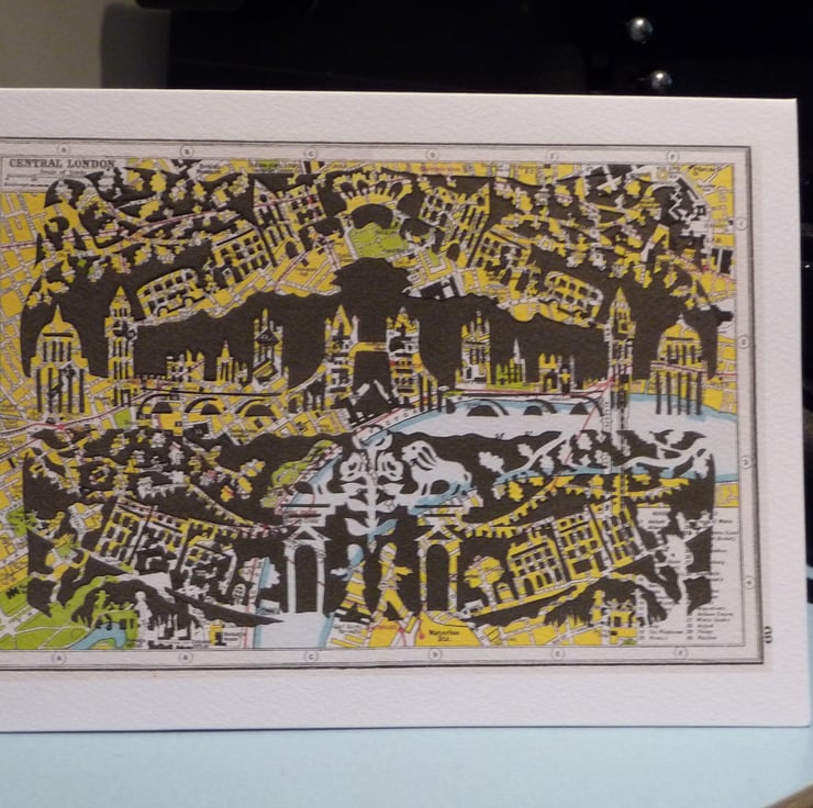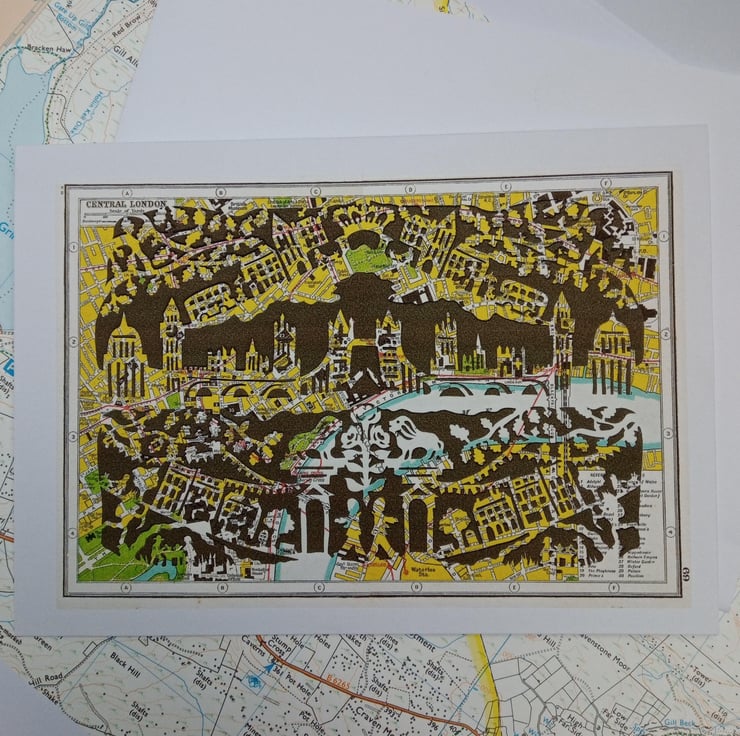 This is a lovely print of an original design by myself of a papercut that I did on old vintage map of London.