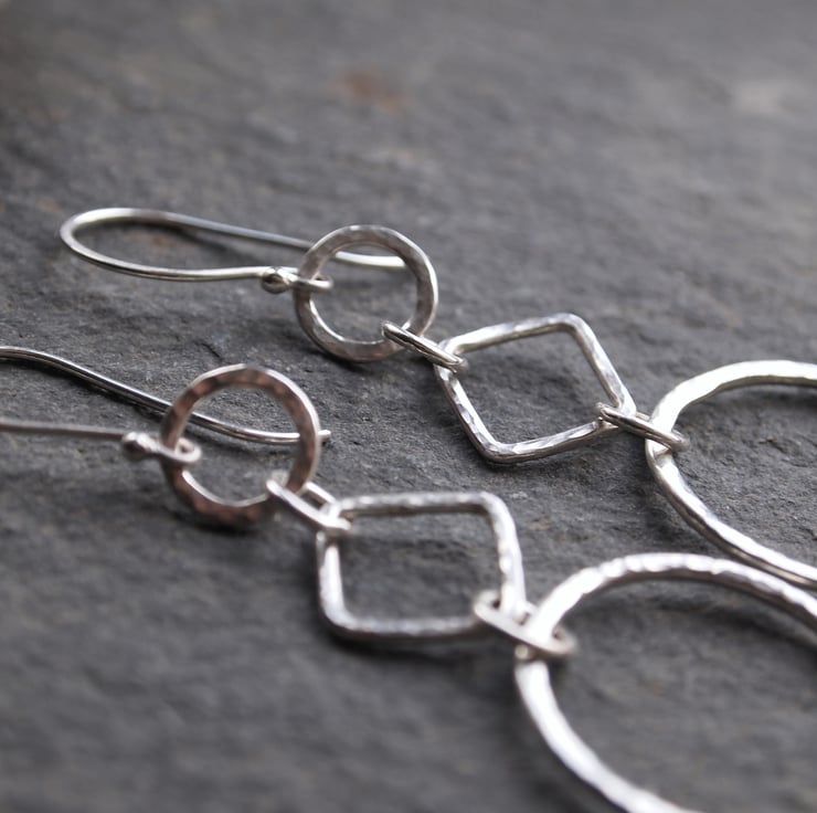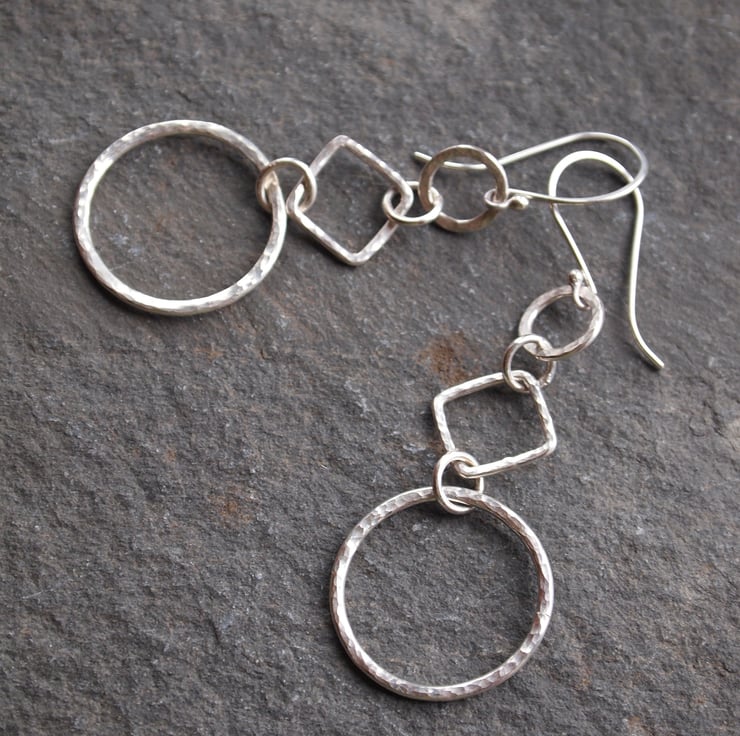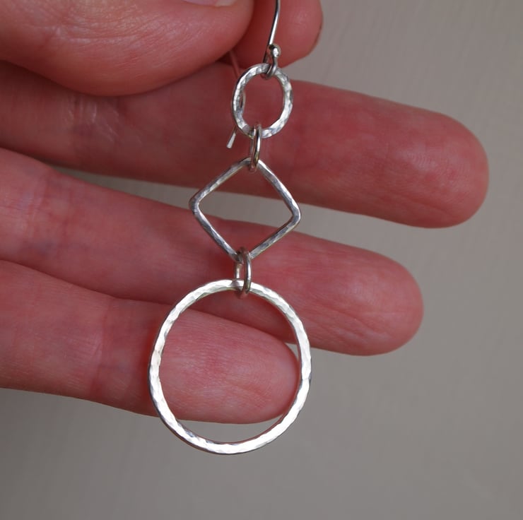 These long, elegant earrings are entirely handmade from sterling silver. The hoops & diamond shaped pieces have been hammered to add texture, which makes them sparkle beautifully as they twiddle and catch the light. They have been finished to a high shine.