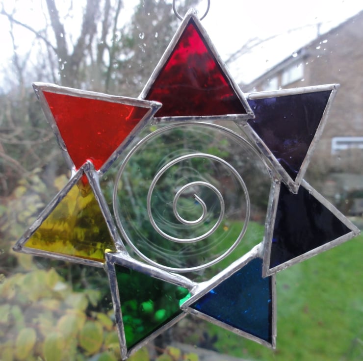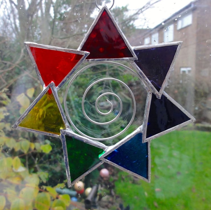This sun catcher measures 12cms x 12cms. Each triangle measures 4cms x 3.5cms. Each piece of glass has been copper foiled and then soldered, each triangle slightly overlaps the other to form a circle and a spiral has been soldered in the middle. A ring has been attached for hanging purposes.
