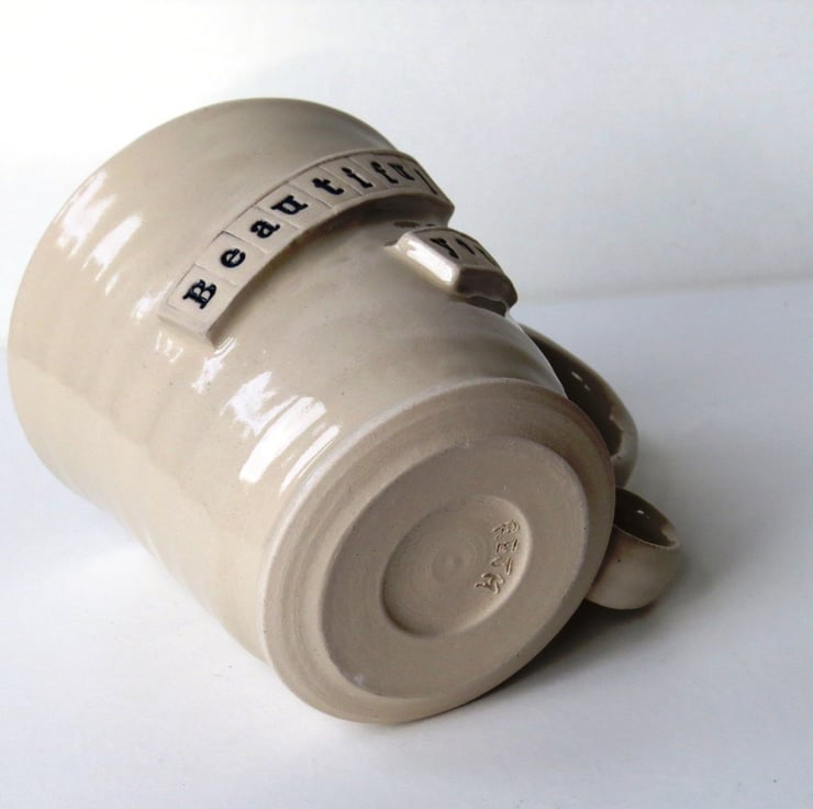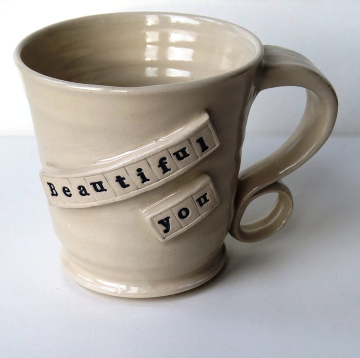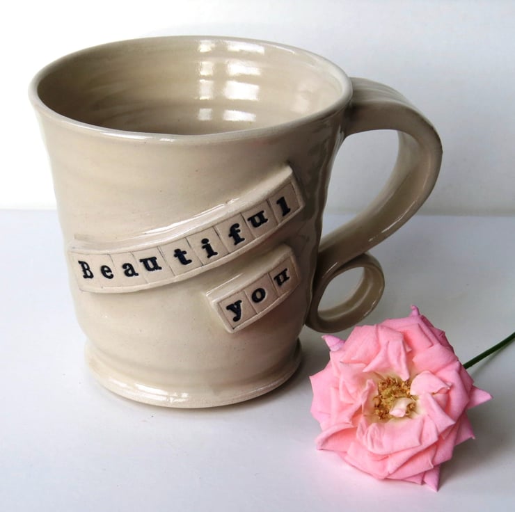 It has the words 'Beautiful You' stamped into raised clay on the side of the mug.