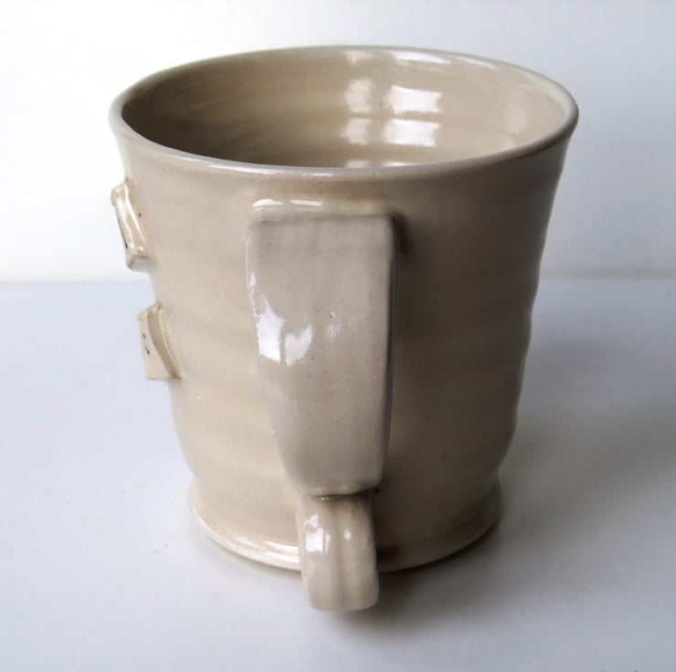 I threw this mug on the potter's wheel using a white stoneware clay. I then turned the base and added the handle and decoration before bisque firing the mug. I glazed it using a lovely transparent glaze and again fired it, this time to 1240C stoneware making it strong and durable.