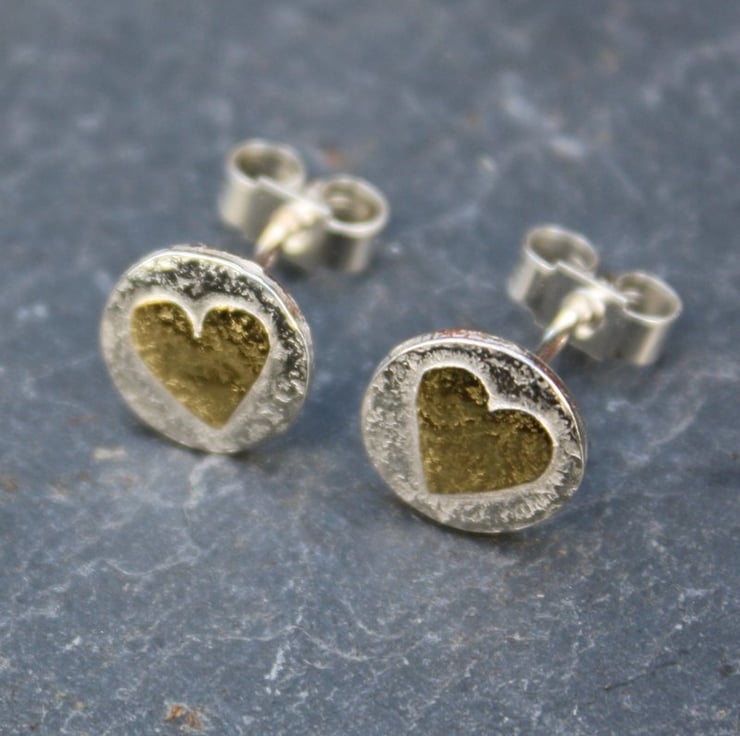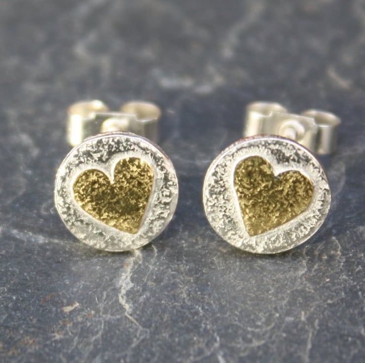 Small silver discs with 18ct gold hearts are beaten for texture and burnished for a subtle shine.
