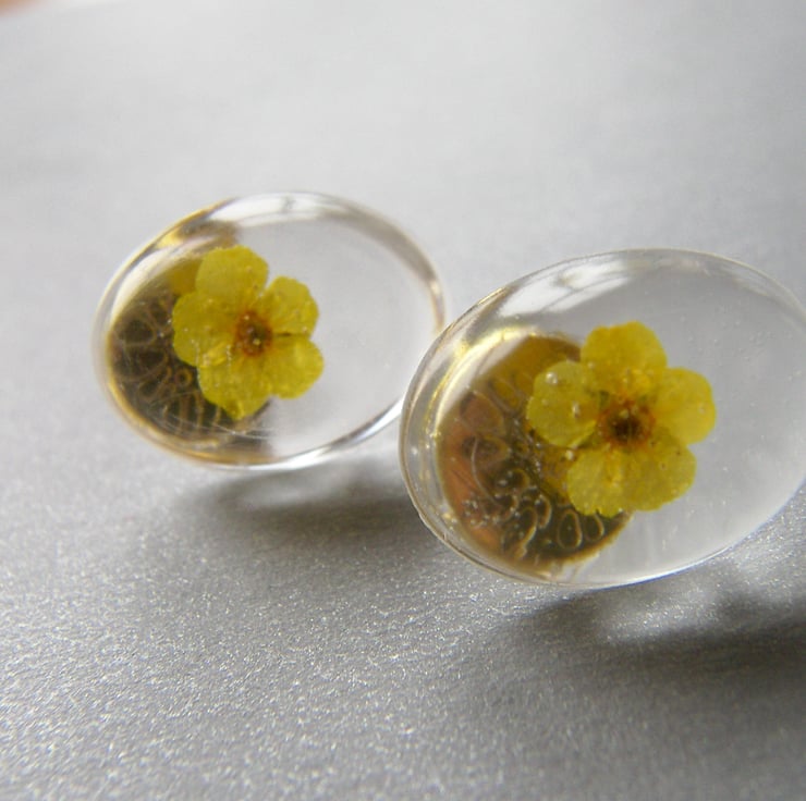 Description: Cute little yellow real flowers have been set in clear UV resistant, non toxic resin.. measures approx 20mm x 15mm on gold plated ear posts with butterfly backs. So pretty:) summery sunshine