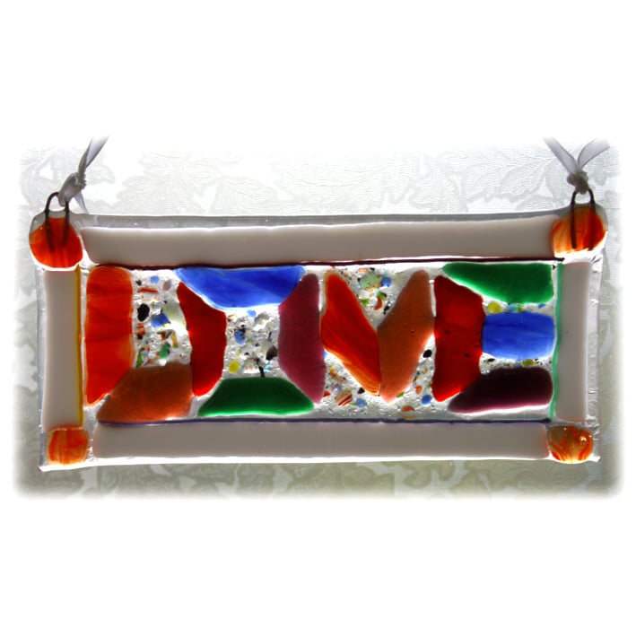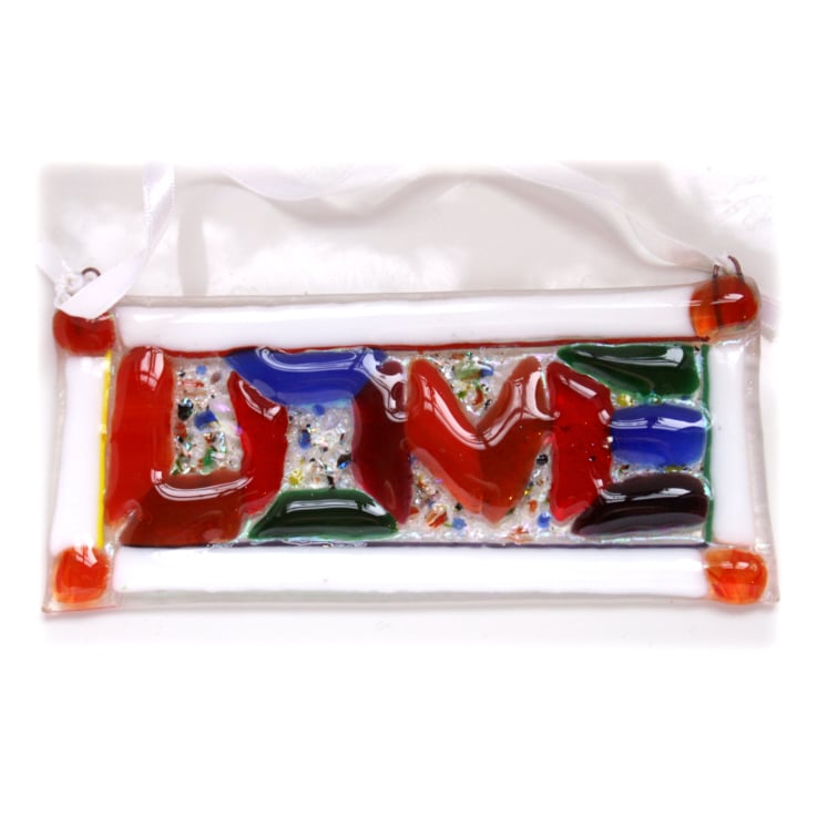 On a base of clear glass, I've cut out the letters to spell Love using glass coloured in all the shades of the rainbow. I've then scattered some multi-coloured and and sparkly dichroic frit between the letters before framing the plaque with white glass..