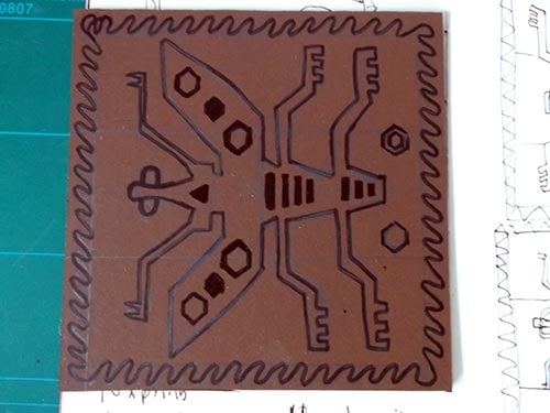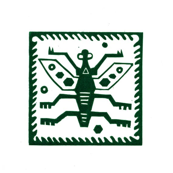 A linocut print featuring a flying insect and symbols; this image is inspired by the designs and symbols on a Peruvian textile that I bought in the USA years ago.