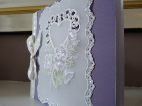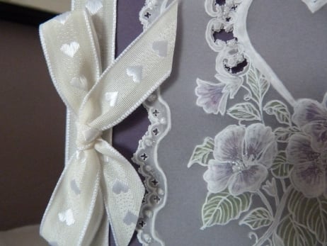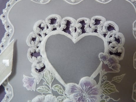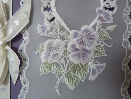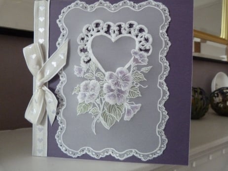 A beautiful romantic design of heart and flowers, cut, embossed from parchment. The flowers have been coloured with pale lilac and the leaves in pale green. Highlit with silver glitter. Mounted onto purple vellum and then onto purple card. Finished off with ivory heart ribbon and bow.