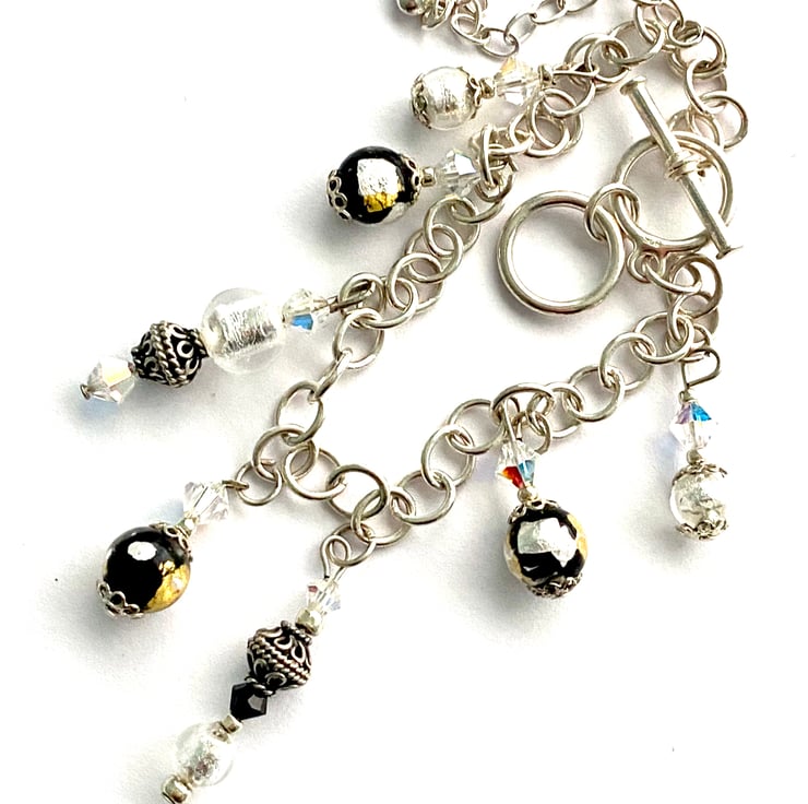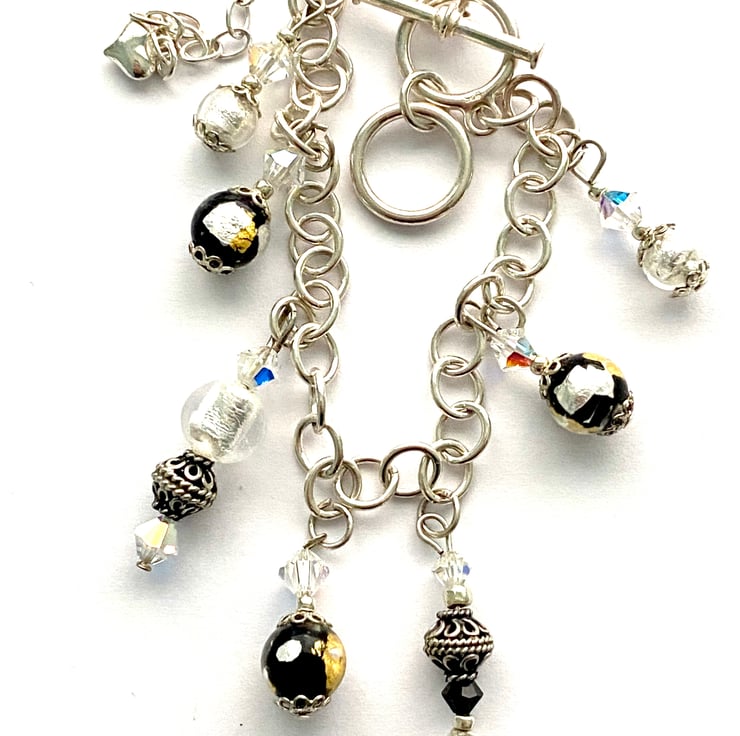 Murano glass and sterling silver charm bracelet with Murano glass beads and Swarovski crystal beads. The bracelet and charms are sterling silver with a Swarovski crystal studded heart charm and silver, black and gold Murano Glass beads with black Swarovski crystal beads. The bracelet measures 20cm. in length with an extender chain which measure 5cm.This gorgeous bracelet is presented in a velvet gift bag all ready for giving.