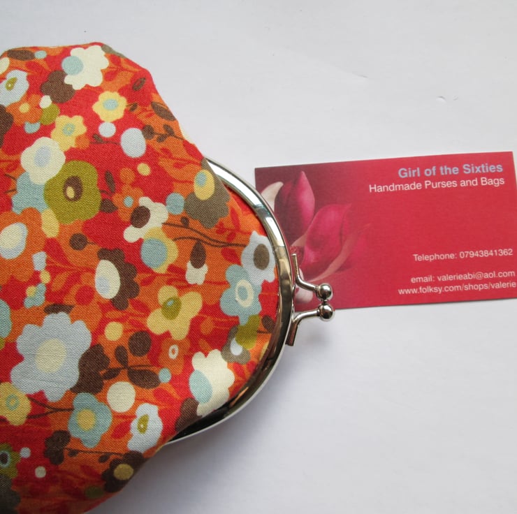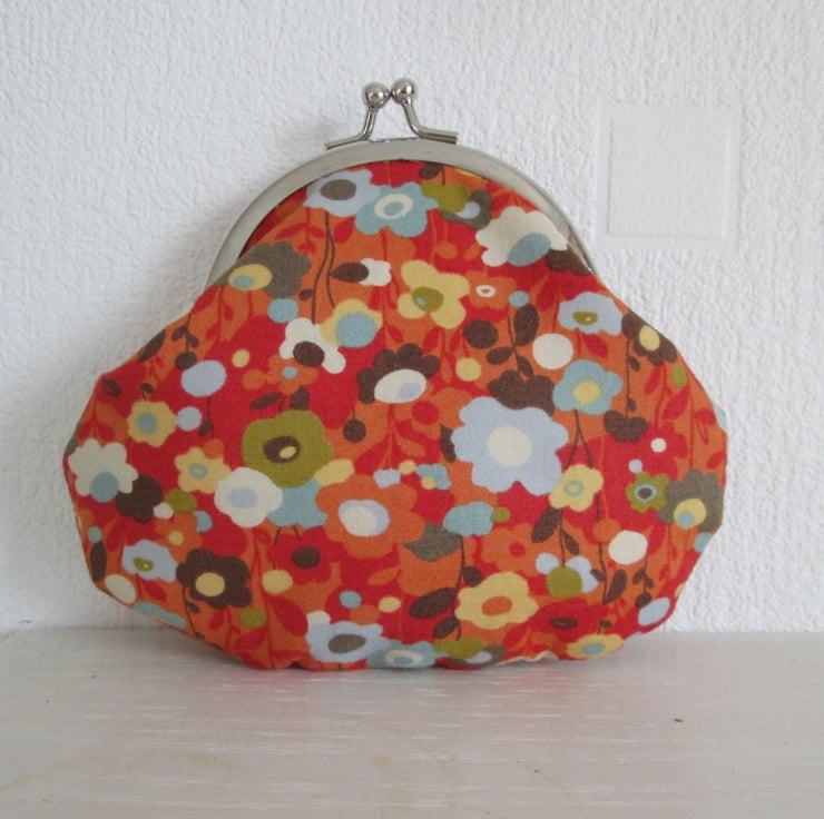 Perfect little purse for your keys, change and credit cards or mobile phone.Pretty moda wonderland fabric with contrasting lining, padding and metal frame clasp.