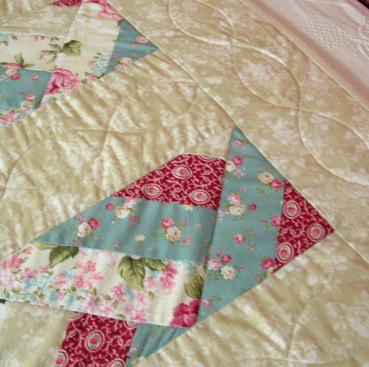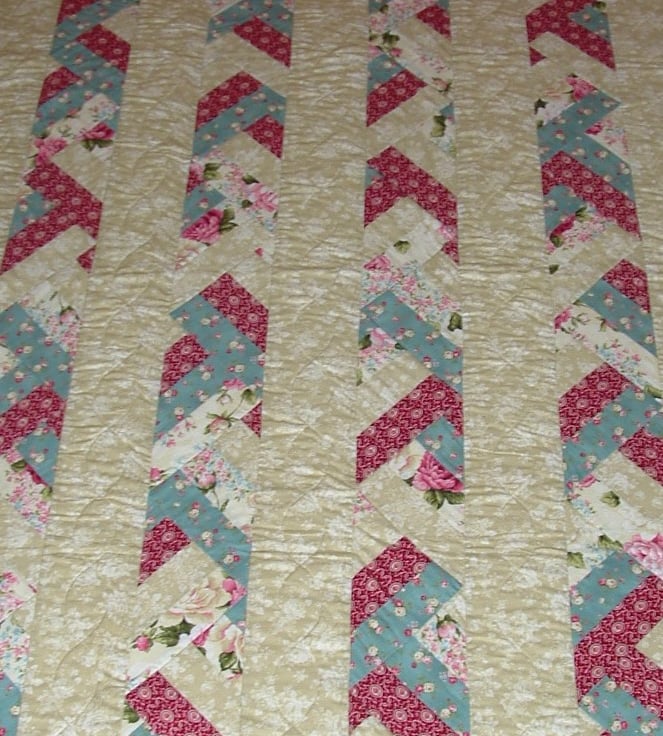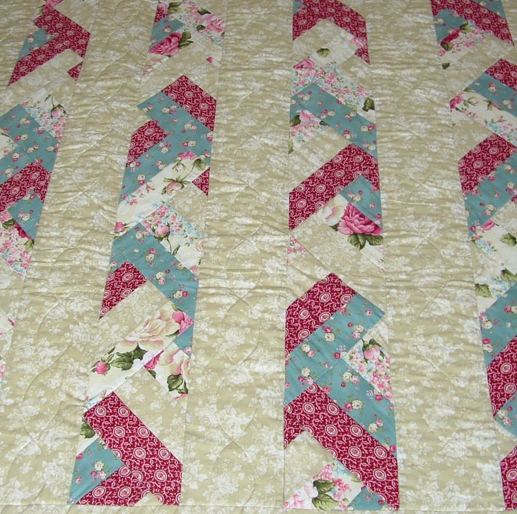 Patchwork quilt with a braided pattern. 100% cotton from the Clothworks Clarabelle range in shades of pink floral, blue, cream. The quilt measures 140cm wide by 177cm long which fits the top of a double bed or it would also be at home as a throw for a sofa or chair. The quilt filling is an 80/20 warm bond cotton blend and is backed with a natural cream calico. Machine quilted using a chain pattern on borders and sashes and zigzag pattern on the braids. Binding in cream spotted cotton, hand finished.
