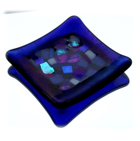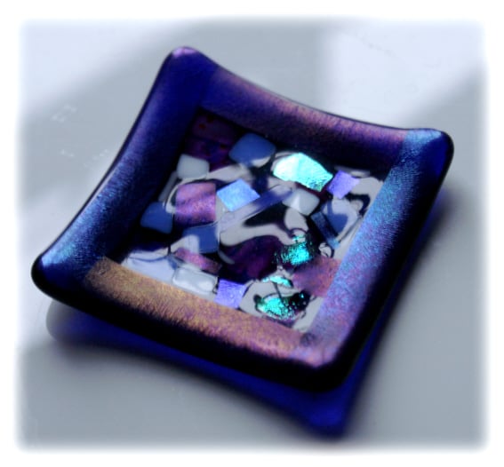 A little, 7cm square dish, twice fired in my kiln, first to fuse all the glass together, 2nd to slump it over a little mould into a shallow dish shape.
