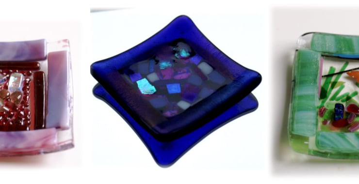 A little, 7cm square dish, twice fired in my kiln, first to fuse all the glass together, 2nd to slump it over a little mould into a shallow dish shape.