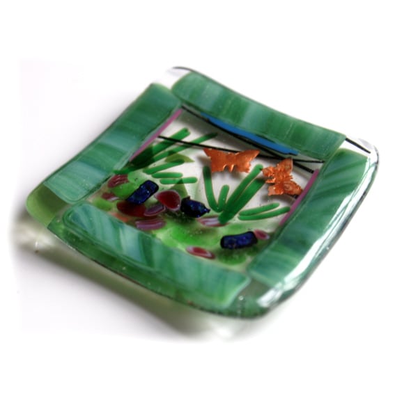 On a base of collage glass, I've made a little picture using 2 butterflies cut from copper and trapped within the layers of glass. I've then added green and coloured glass to hint at plants and a tiny water scene and used some precious dichroic glass to make it extra special with added sparkle.