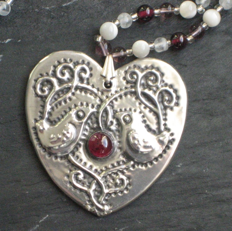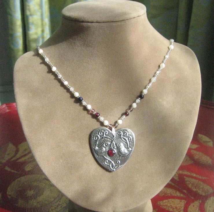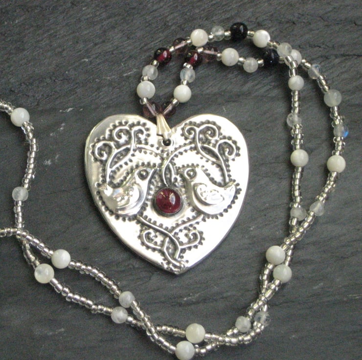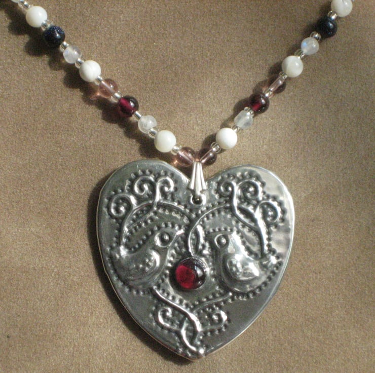 This gorgeous necklace has been hand-made in shiny lead-free modern pewter. The heart-shape, which measures 37 x 40mm, features a beautiful garnet cabochon, and is suspended from a delicate string of beads consisting of mother of pearl, garnet, blue goldstone, pale amethyst, labradorite and silvered glass. The necklace is 48cm long and fastens with a barrel clasp. A perfect gift for a Birthday, Christmas, Valentines, Mothers' Day or 10th Wedding Anniversary.