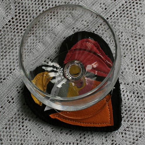 The design, cut from re-cycled knitted fabrics, is applied to the black background of a fleece fabric. A layer of wadding is enclosed between the decorated top and a backing of matching black fleece. The coaster is blanket stitched by hand around the edge. The design is then quilted to hold the layers firmly together.