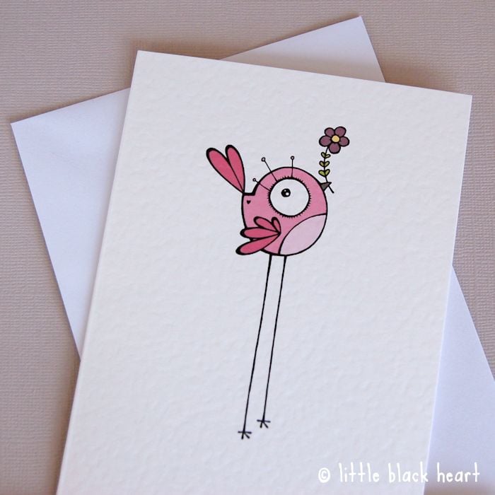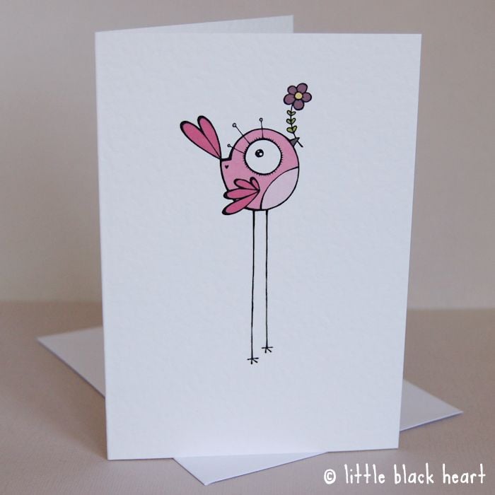 unique and quirky illustrated card featuring a cute pink bird. she is holding a lovely purple flower, just for you! could be used for any occasion: a thank you, a birthday... or maybe if you need to say sorry and make up!