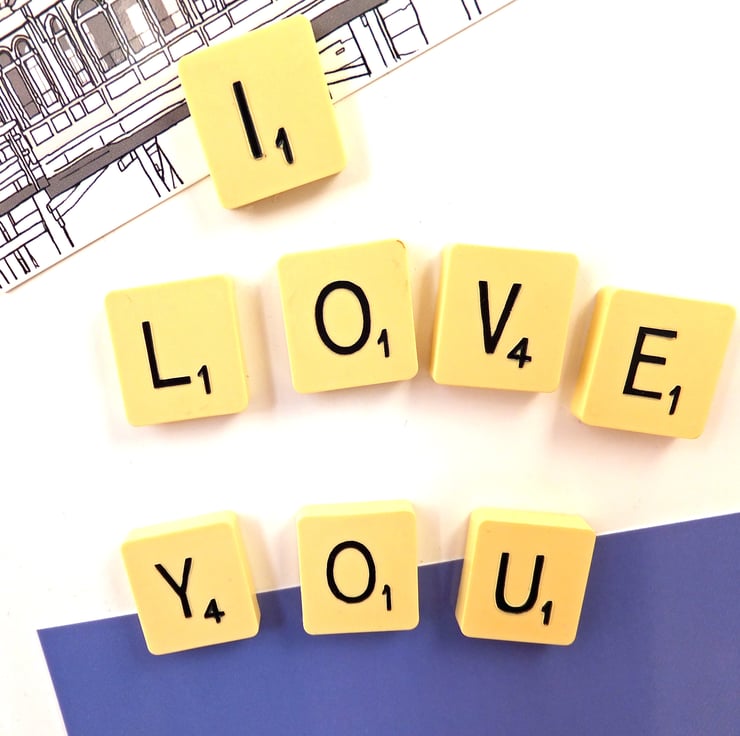 These recycled vintage Scrabble tiles have been turned into cute, eco-friendly fridge magnets. They are a fabulous way to tell someone you love them. Every time they see these magnets they'll feel good and think of you!