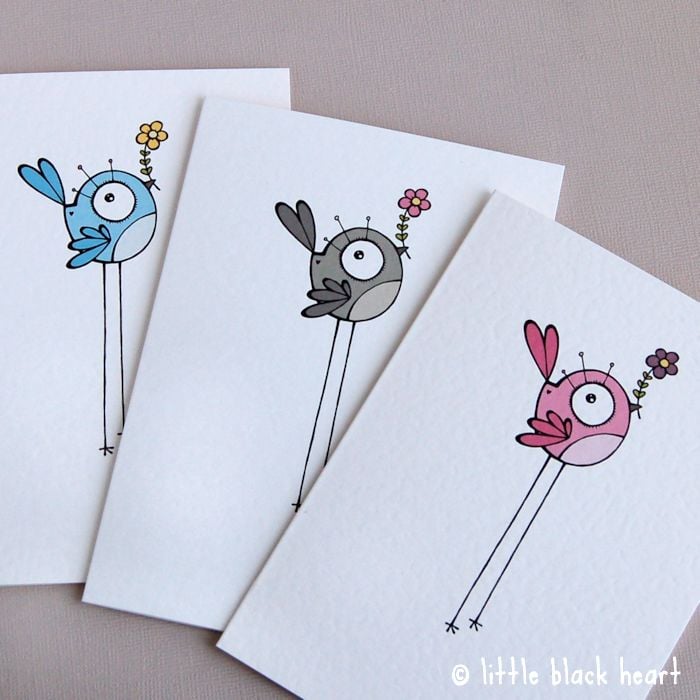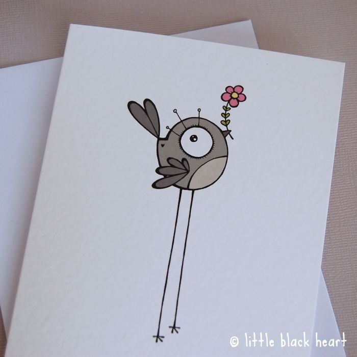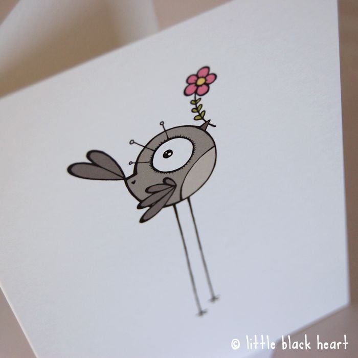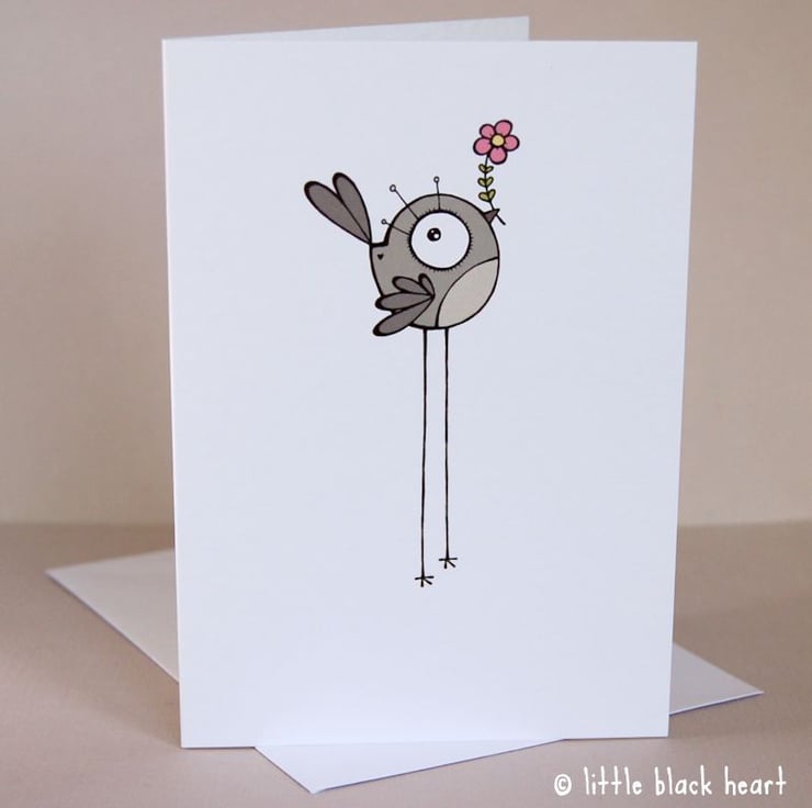 unique and quirky illustrated card featuring a sweet grey bird, holding a lovely pink flower just for you! could be used for any occasion: a thank you, a birthday... or maybe if you need to say sorry and make up!