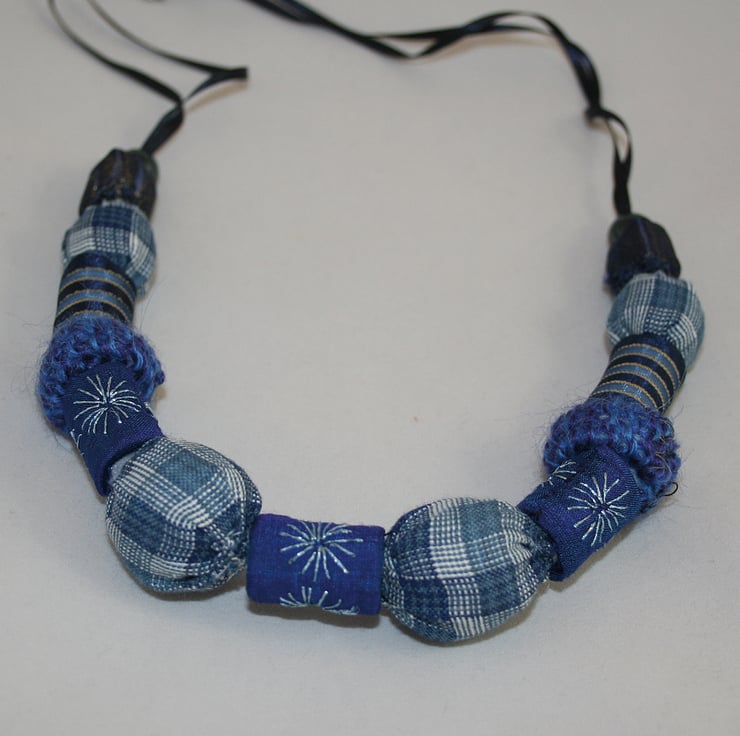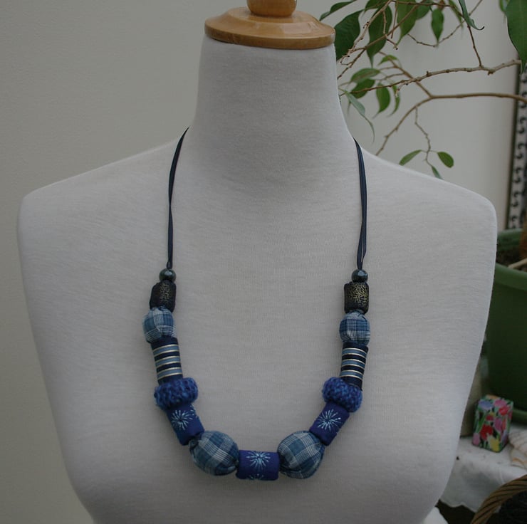 A pretty necklace featuring four types of hand made textile beads, in shades of blue and white.