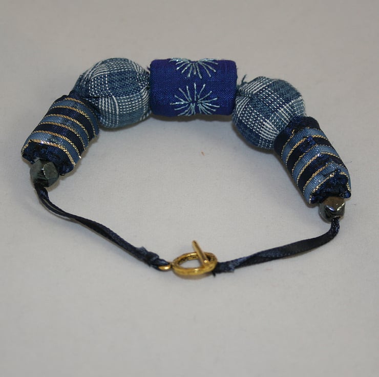 A pretty bracelet featuring three types of hand made textile beads, in shades of blue and white.