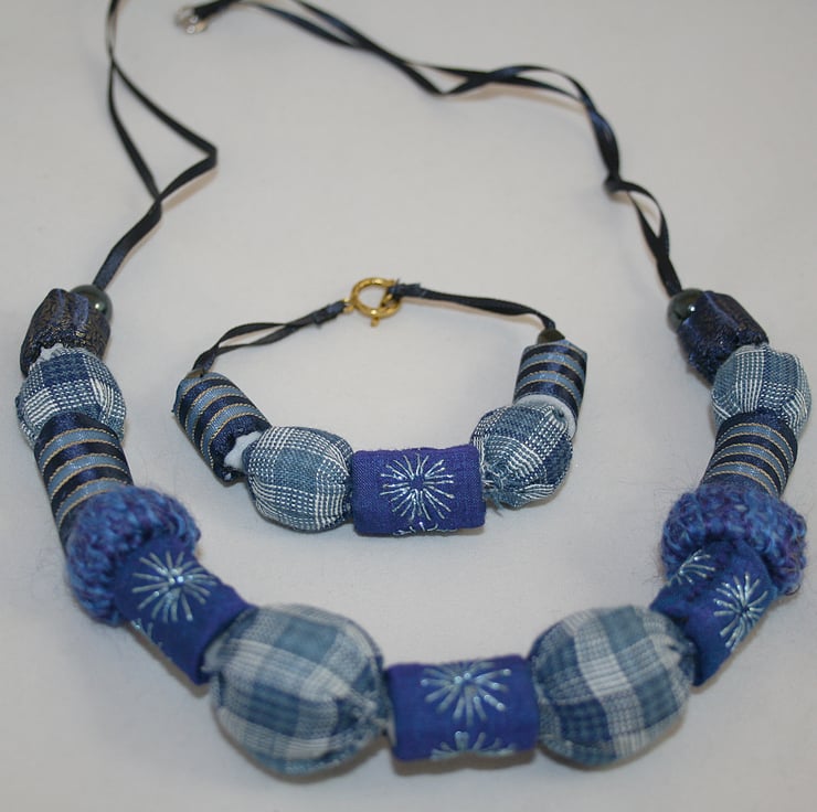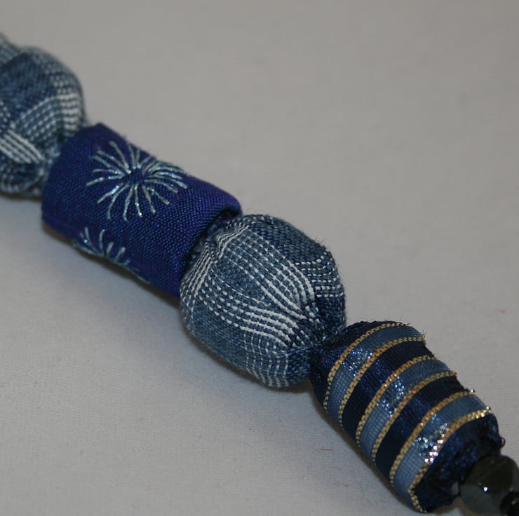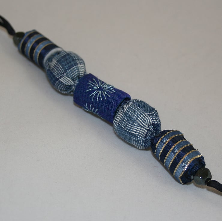 The textile beads which form this necklace have been carefully hand-stitched and constructed using three different methods. A total of 5 textile beads, and two blue ceramic beads, complete the design. The 'recipe' is as follows: