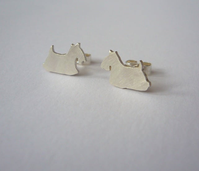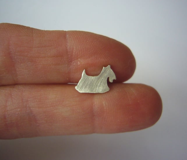 These are simple, cute dogs, hand cut out of 1mm thick sterling silver. They are approximately 1.2cm wide and 0.8cm high, have a pin soldered to the back and have a brushed finish.