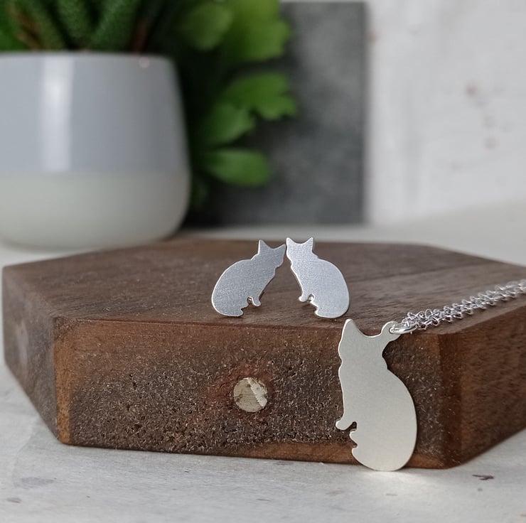 I have created this necklace by cutting the cat shape from recycled sterling silver by hand, after filing and finishing it was attached to a sterling silver chain. It is part of a collection of sterling silver animal jewellery, which includes matching earrings.
