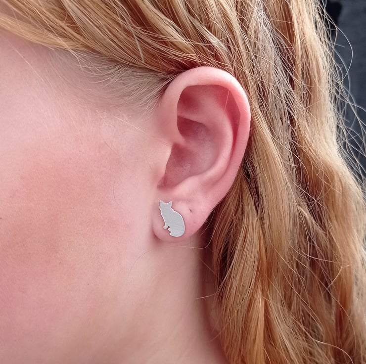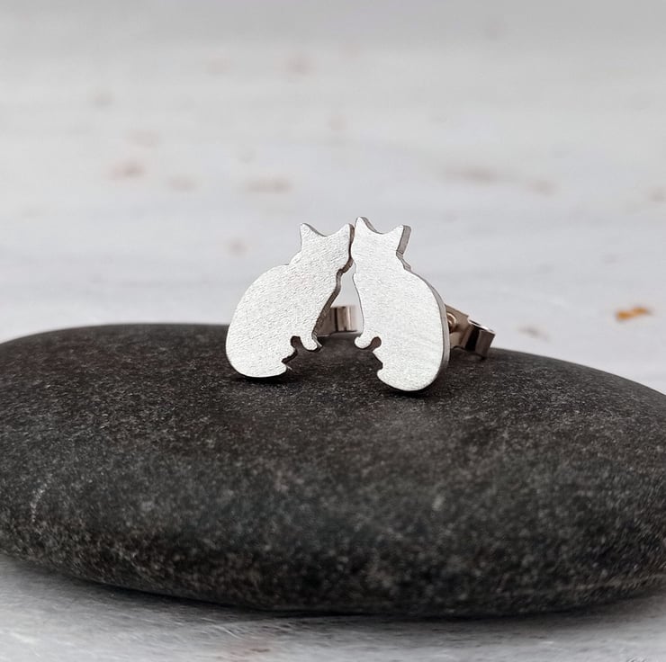 I have created these cat stud earrings by cutting the shapes from recycled sterling silver by hand, then soldering sterling silver ear posts to the back. They are part of a collection of sterling silver animal jewellery, which includes a matching necklace.