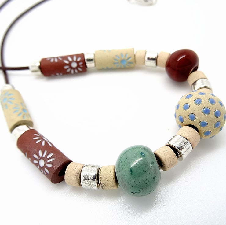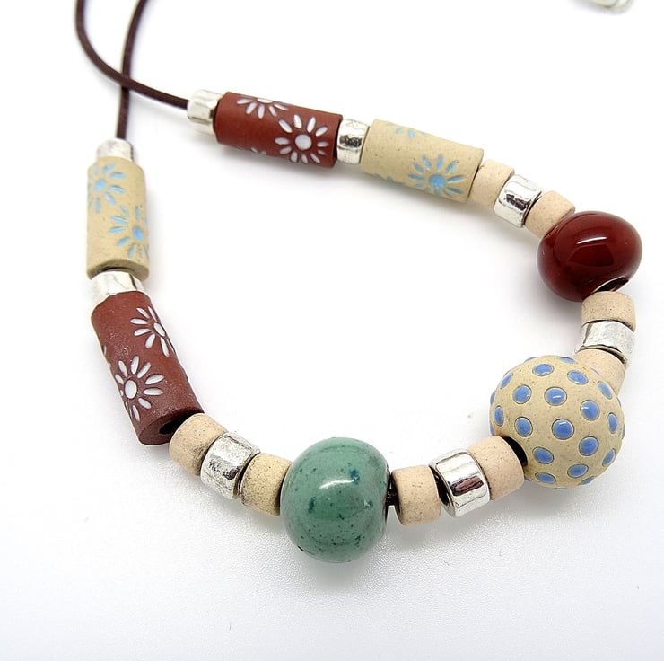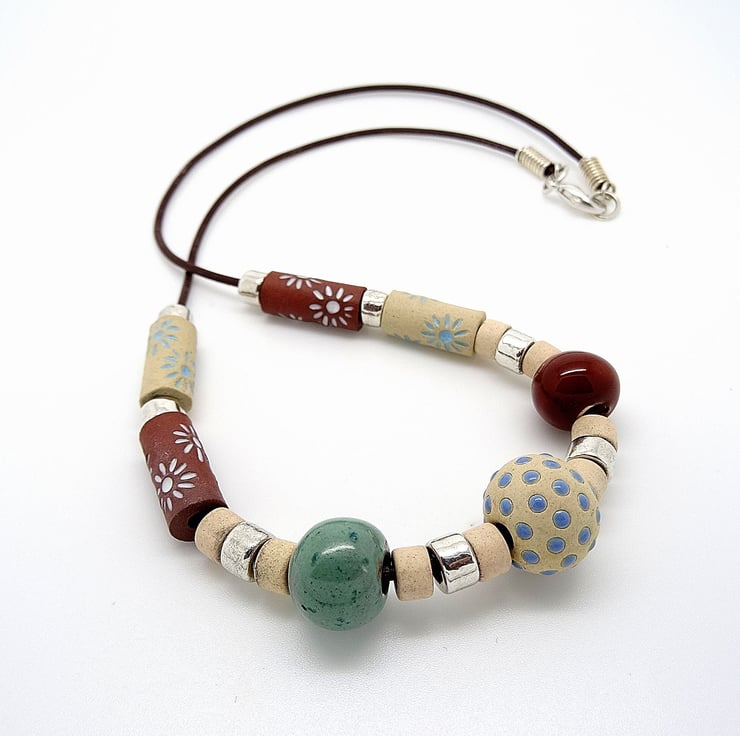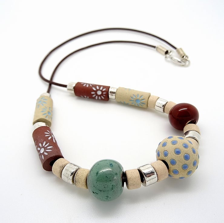 This is a lovely necklace made entirely from ceramic beads, consisting of a spotty 14mm round focal, four 20mm long patterned tubes, small tubes and two 12mm rounds. The necklace is hung on brown leather cord and measures 47cm (18.1/2") finished with a silver lobster clasp. As all of the jewellery in my shop are individual pieces made by myself, this is the necklace you will receive. It will arrive gift wrapped in tissue paper and a organza bag.