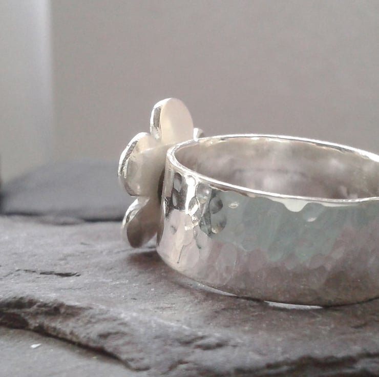 A generous band of sterling silver measuring 9mm has been gently hammered to catch the light and add sparkle, topped off with a handcut sterling silver flower.