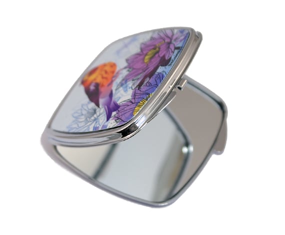Ladies compact mirror for inside a pocket or handbag. Hand illustrated design with purple flowers and a beautiful orange bird. Cheerful bright colours to brighten up your day. An ideal accessory gift for someone who loves nature and birds.