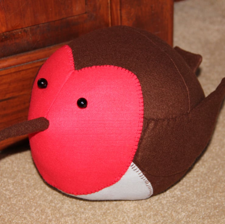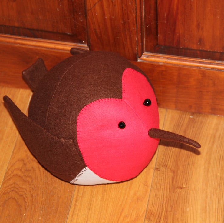 Each Robin is part machine sewn and finished by hand. With all the bird doorstops, the outer ‘feathers’ are felt which has been laid over an inner cotton skin which contains the main stuffing and weight. The weight is approx 1.2KG of clean pea gravel inside a bag (enough weight for most internal doors), The stuffing in the inner skin is a mix of shredded cotton for bulk enclosed in regular hypoallergenic toy stuffing. Because each bird is hand made, there will be some differences in size, so where I have sewn the felt outer layer slightly larger, there will be some toy stuffing between the felt and the cotton skin to keep the little chaps firm.