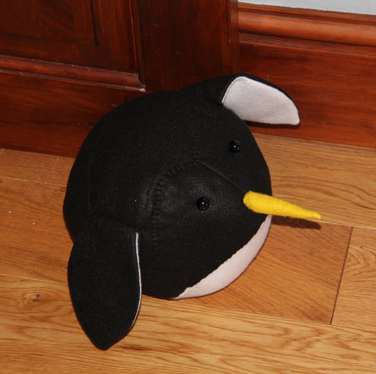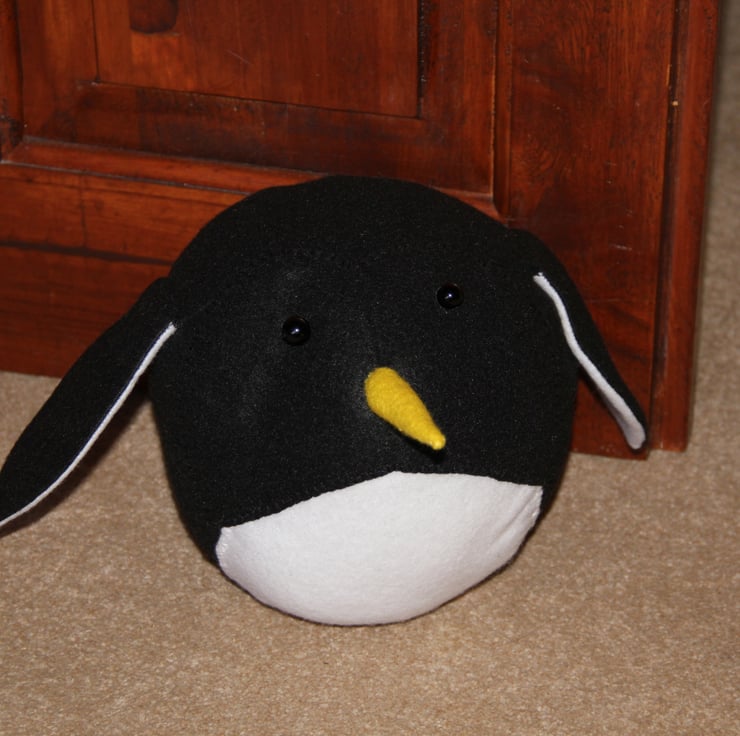 Each penguin is part machine sewn and finished by hand. With all the bird doorstops, the outer ‘feathers’ are felt which has been laid over an inner cotton skin which contains the main stuffing and weight. The weight is approx 1.2KG of clean pea gravel inside a bag (enough weight for most internal doors), The stuffing in the inner skin is a mix of shredded cotton for bulk enclosed in regular hypoallergenic toy stuffing. Because each bird is hand made, there will be some differences in size, so where I have sewn the felt outer layer slightly larger, there will be some toy stuffing between the felt and the cotton skin to keep the little chaps firm.
