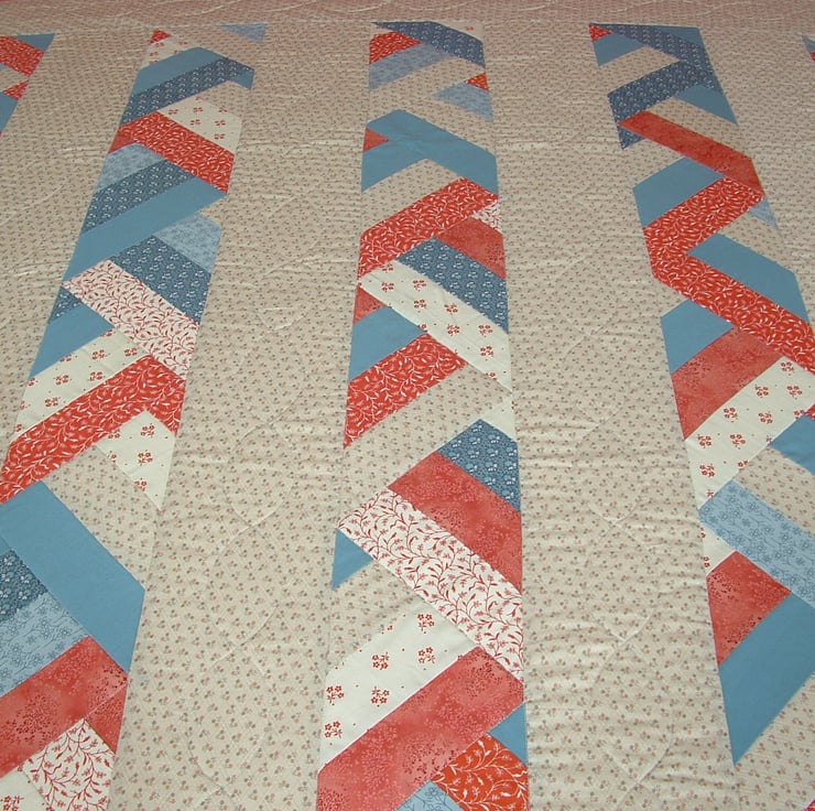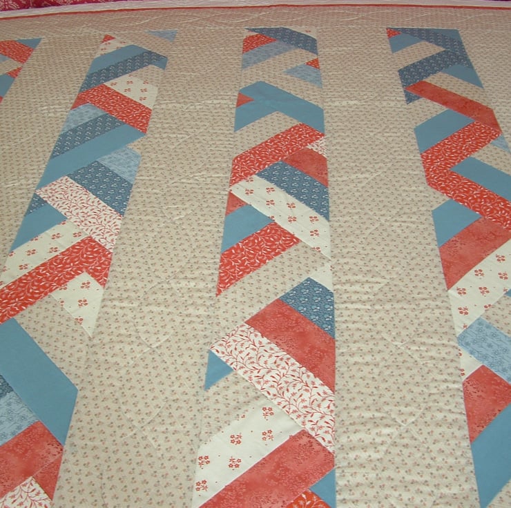 This 100% cotton quilt has a braided pattern in blue, terracotta and cream colours. The borders and sashes are in a small scale beige print. The quilt is backed with a plain cream calico and edged with a terracotta binding, hand finished at the back. The middle layer is a Warmbond 80/20 cotton blend. Machine quilted using a chain pattern on the borders and sashes and zigzag pattern on the braided strips. The quilt measures 177cm x 147cm (approx. 70"x58") and would fit the top of a double bed, a single bed or would be equally at home as a throw or lap quilt for a sofa or chair.