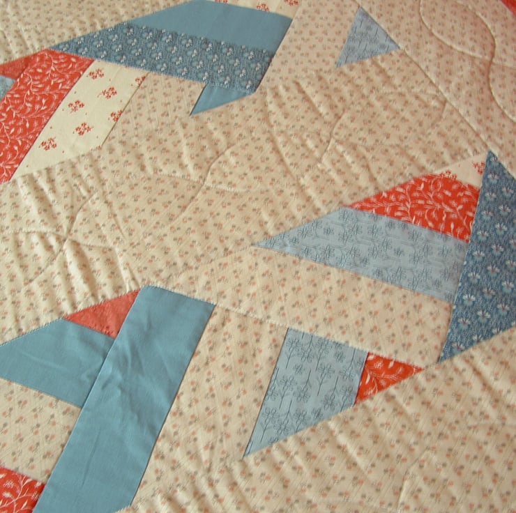 I greatly enjoy the process of taking a few pieces of fabric from my collection and sourcing other fabrics to add to these to make a larger project even though it can be a time consuming task, even before the sewing starts! A few (almost vintage) Laura Ashley terracotta/cream pieces were the starting point for this one. I felt that the blues were a nice contrast to the terracotta.