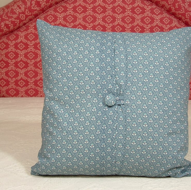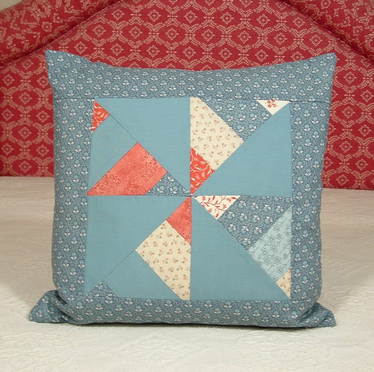 A 38cm (15") square patchwork cushion to match the quilt already listed in my shop. The cushion has four diagonal patchwork sections surrounded by a border. The cushion is backed in the same fabric as the border and has a loop and covered button closure. A duck feather pad is included in the price.
