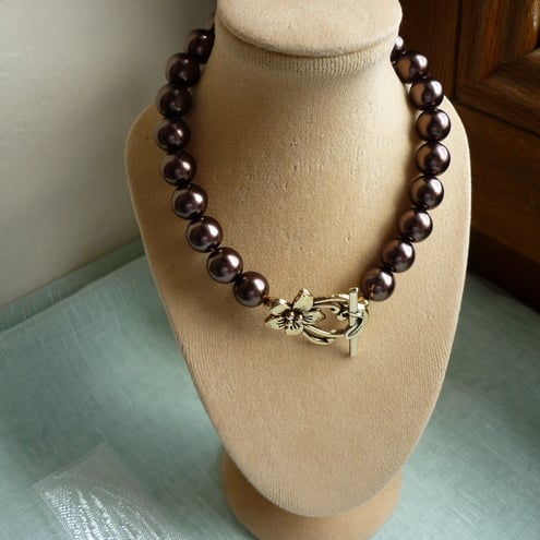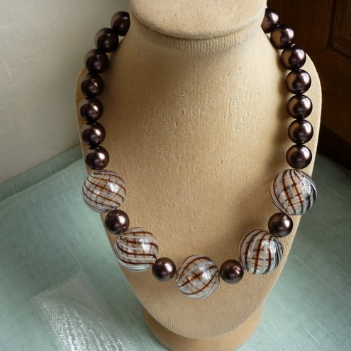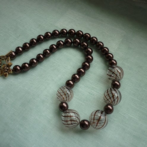 THIS UNUSUAL NECKLACE IS MADE OF CZECH GLASS CHOCOLATE PEARLS ALONG WITH FANCY SEE THROUGH GLASS BAUBLE BEADS WITH CHOCOLATE BROWN SWIRL PATTERN, THE NECKLACE IS FINISHED WITH A FANCY FLOWER SHAPE GOLD PLATED TOGGLE CLASP.