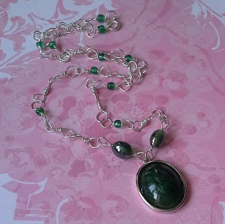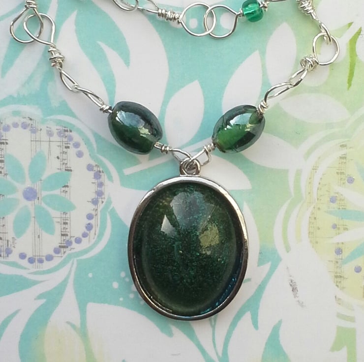 This pretty pendant has been made using Crystal Clear Resin. A metallic green colourant has been mixed into the resin creating a lovely sparkling effect, it has then been fixed into a silver coloured cabochon mount.