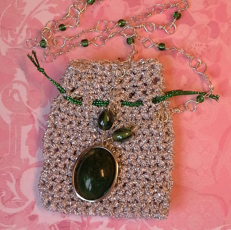 The pendant has then been hung on a 20" handmade silver plated chain with pretty glass beading throughout. This beautiful little necklace also comes with a pretty crocheted pouch to keep it safe.