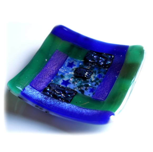 An 8cm square dish, twice fired in my kiln, first to fuse all the glass together, 2nd to slump it over a little mould into a shallow dish shape.