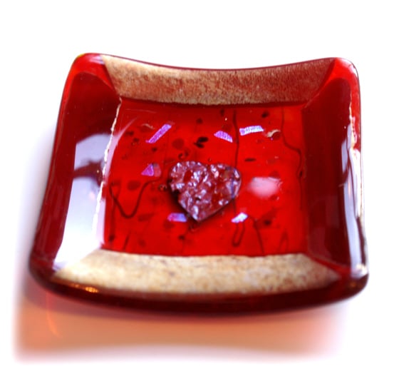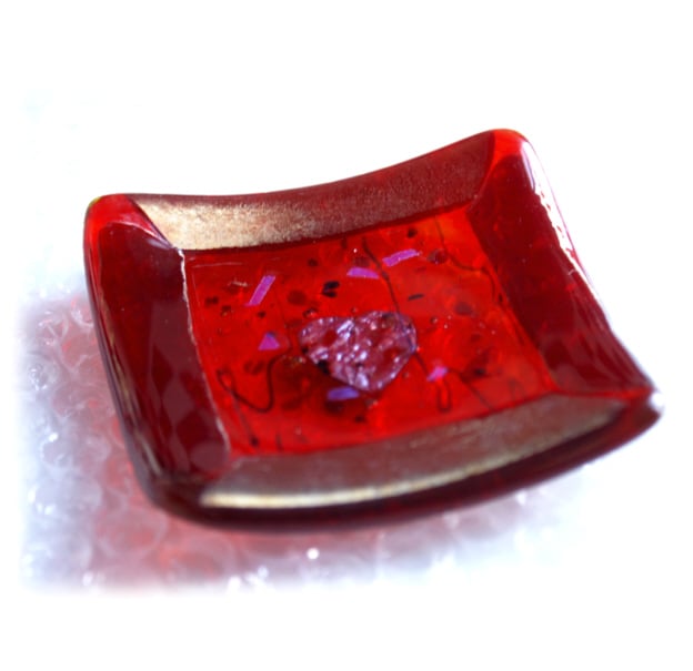 This little dish is made with a border of iridescent red glass on a base of streaky transparent red glass topped with a clear lightly collaged glass..