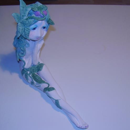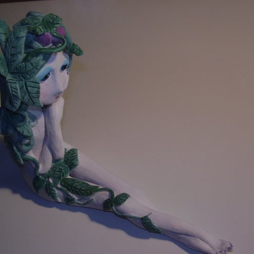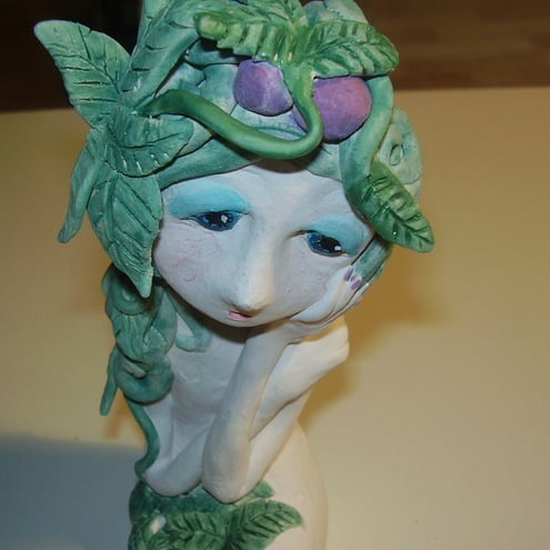 She is handbuilt,and purely original.. designed by myself. She is adorned with tiny leaves and vines and has large sorrowful eyes, she is sweet.