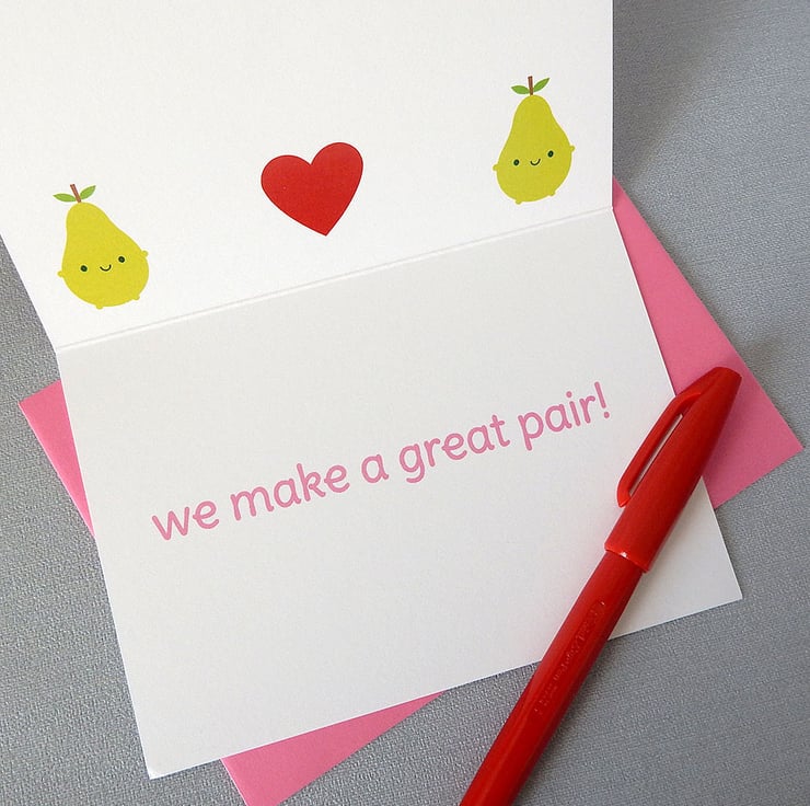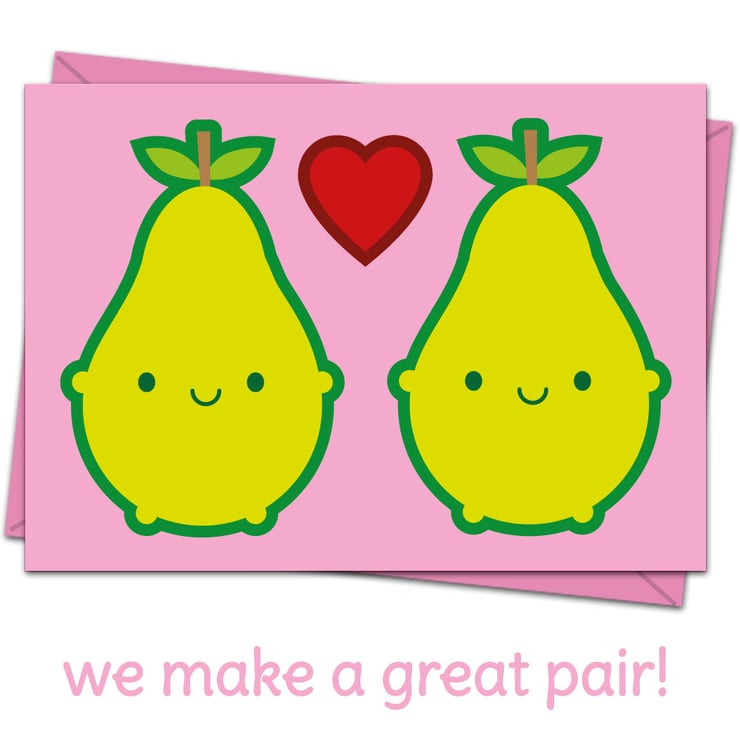 This cute card features a colourful retro design of two kawaii pears. Inside is are the words 'we make a great pair!" with room for your personal message Professionally printed in full colour on all four sides on glossy card. Great for Valentine's Day, anniversaries and your best friend.