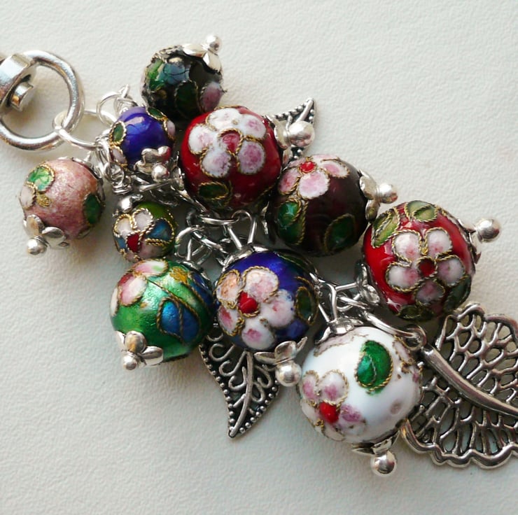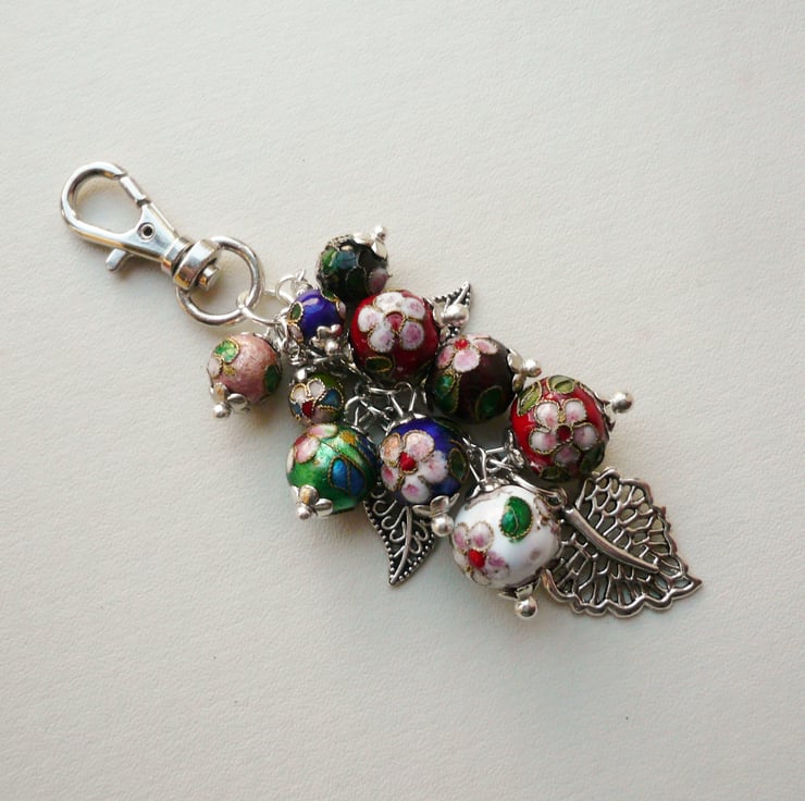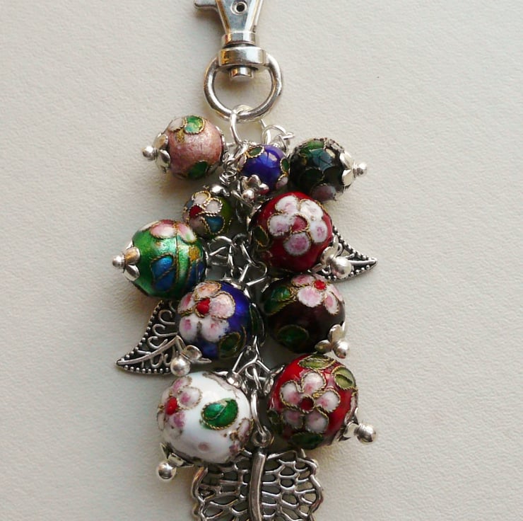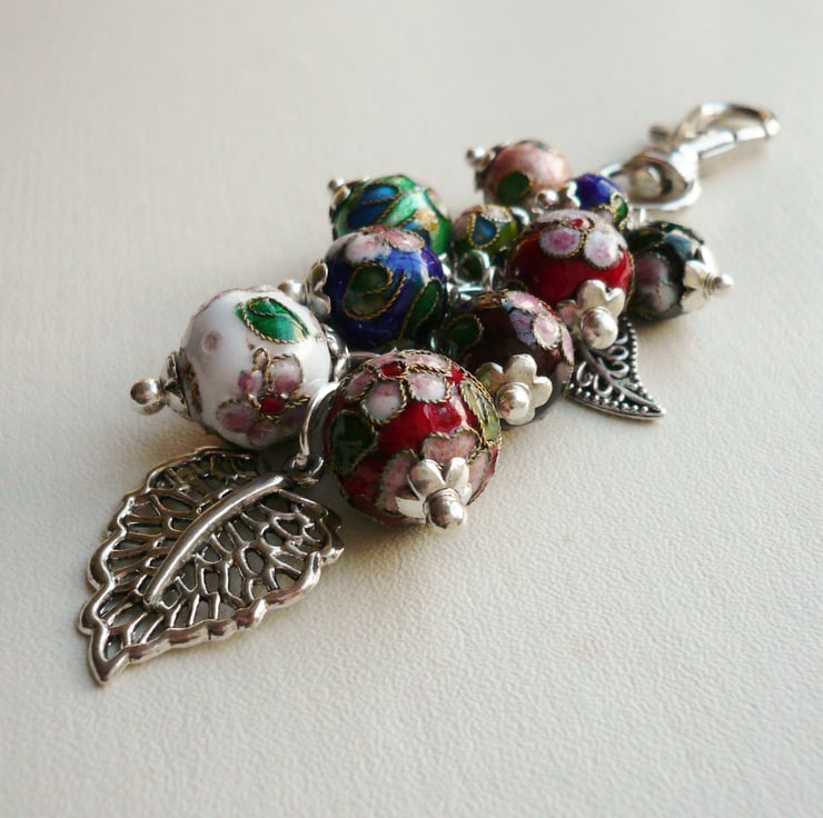 This handbag charm consists of pretty Cloisonne beads in various colours and sizes ranging from 6mm to 12mm. Also includes Tibetan silver bead caps, filigree leaf charms and 20mm leaf charm hanging below. All attached to a silver plated chain and 30mm trigger clasp.