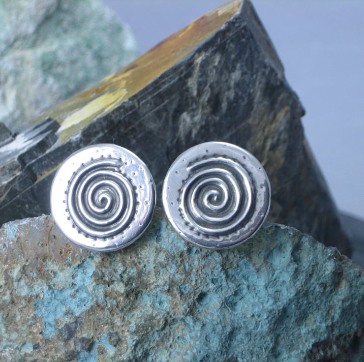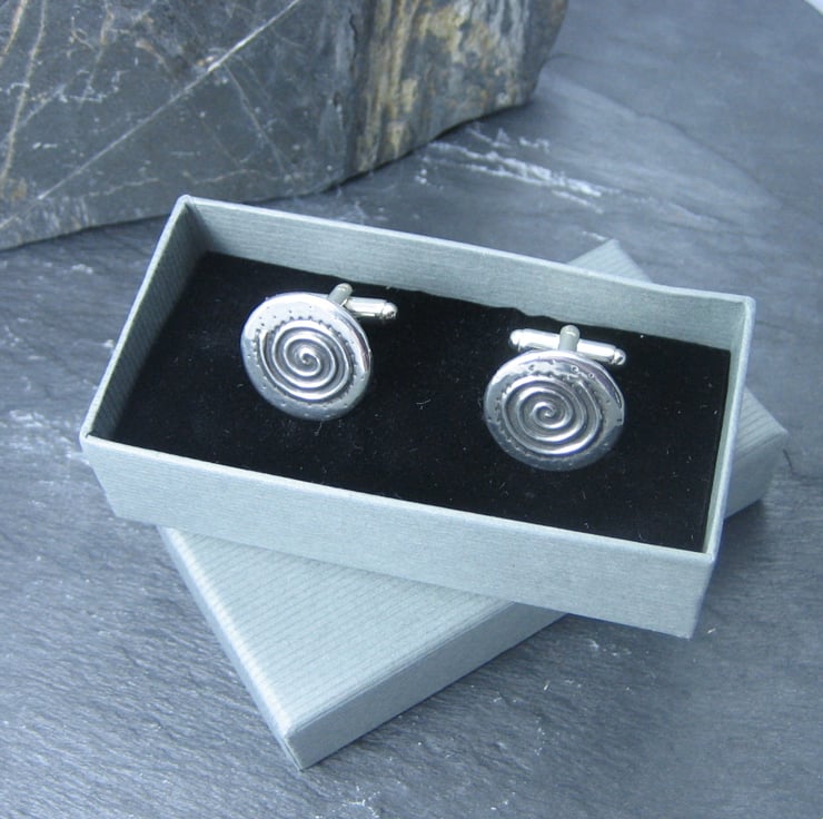 Spiral Cufflinks in Silver Pewter Metal. These cufflinks have been individually hand-made in shiny modern pewter. Due to the method of making, the links will vary slightly. Each link measures 2cm, 0.75ins,across. Gift boxed. A great gift for a man for a 10th Wedding Anniversary, Fathers' Day, Birthday or Christmas.