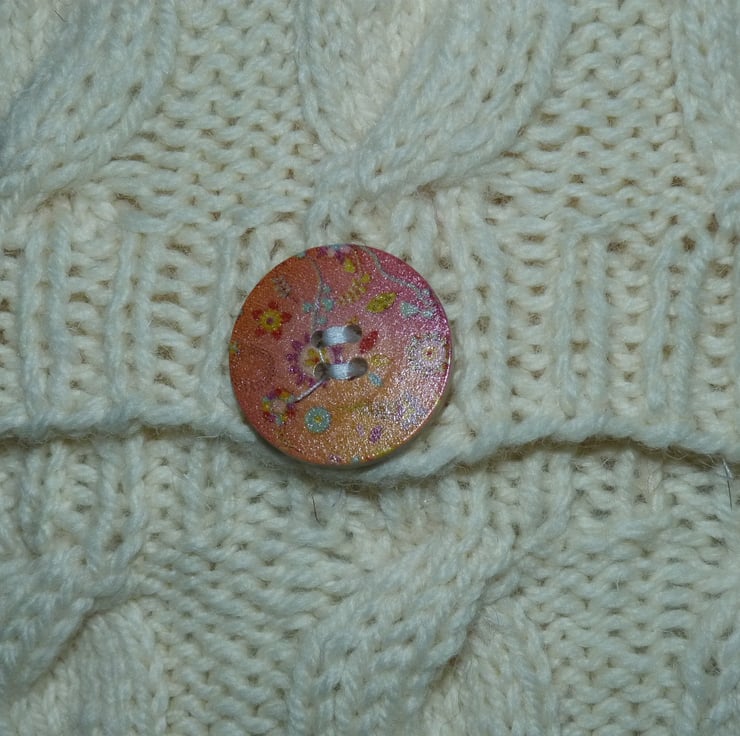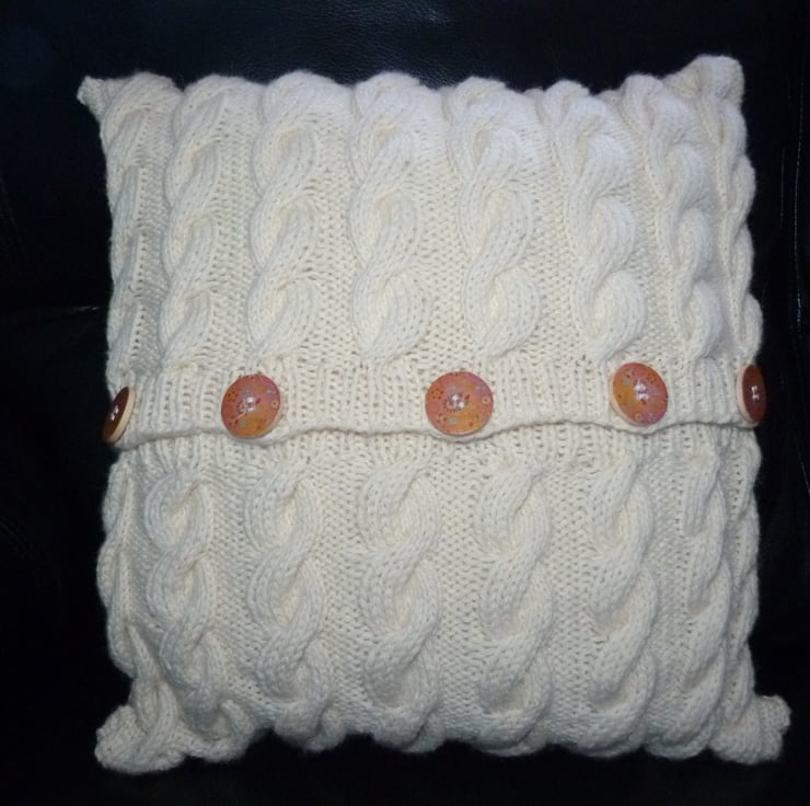 The cushion has a cables design on the front, and the pattern is repeated on the back, with 5 pretty flower design wooden buttons to close the flap.
