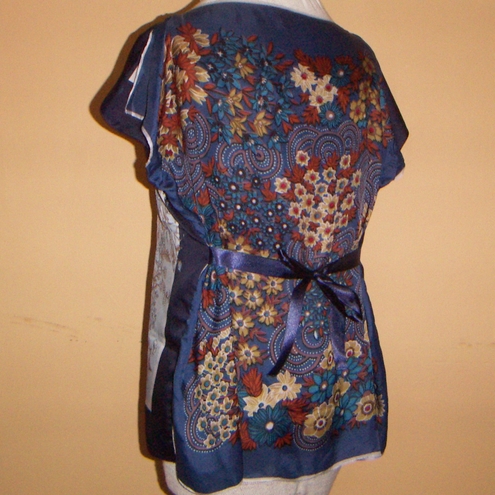 Beautiful scarf top made from vintage scarves in blue tones. Reversible. Estimated size 10-14 but roomy. 26 inches in length.