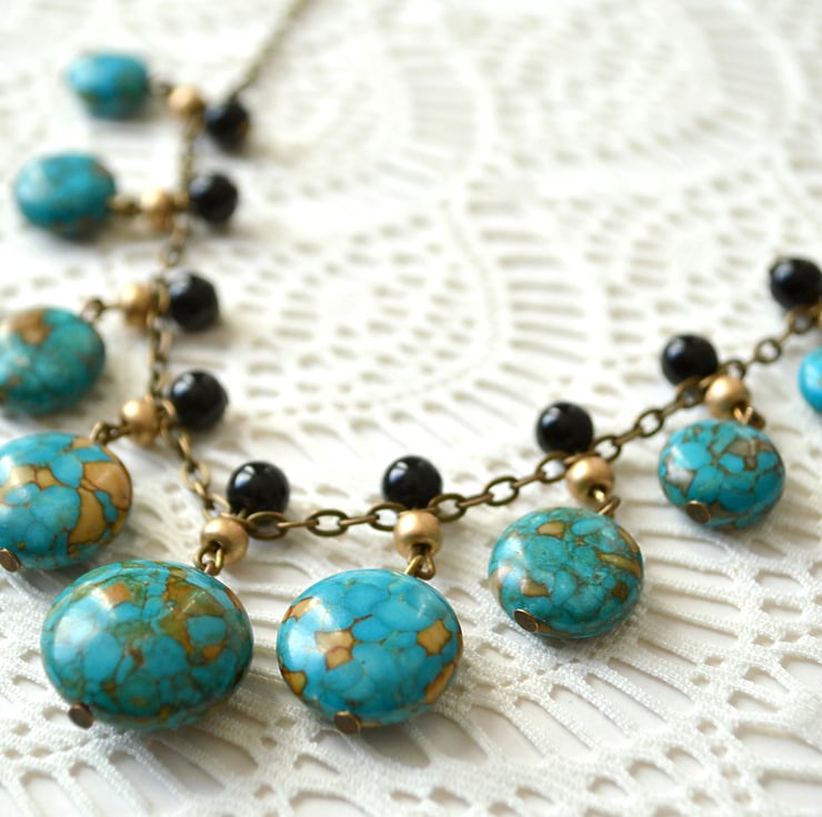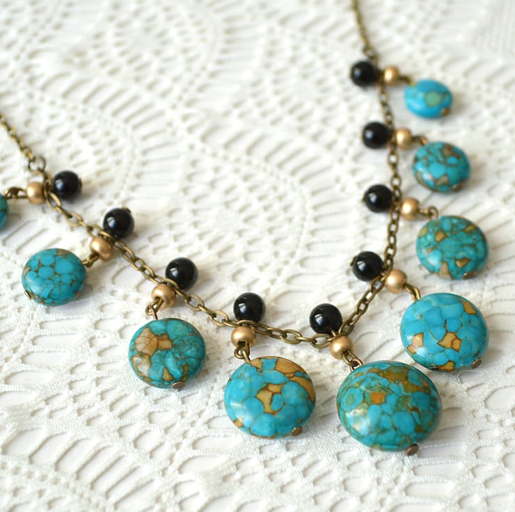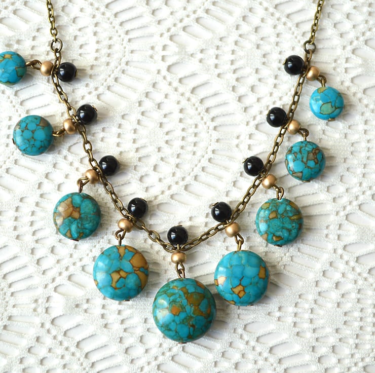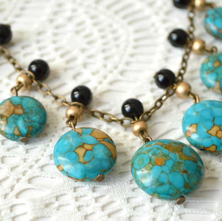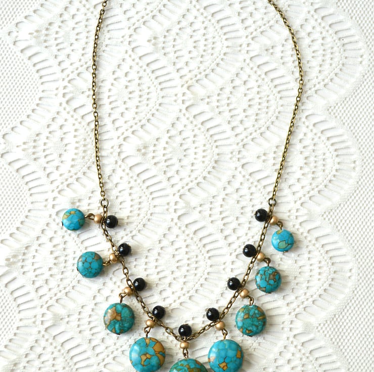 A statement, bib necklace featuring a fan of turquoise Sea Sediment Jasper beads, black and bronze spacer beads and antique bronze findings.